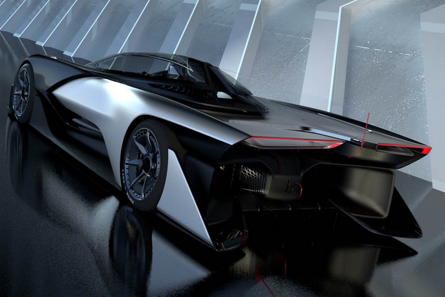 Avec ses airs de Batmobile et de concept Vision Gran Turismo, la FFZERO1 semble débarquer d’un temps futur. Et ce n’est pas avant 2020 qu’il faudra espérer la voir sur nos routes. Ce projet de voiture électrique surpuissante est à prendre au sérieux même si aujourd’hui on doit se contenter d’un simple « show car ». En effet, la société Faraday Future est financée par un milliardaire chinois et 1,4 milliard de dollars va être investi dans le site de production qui sera construit dans le Nevada. L’entreprise a été créée il y a un an et demi et elle compte déjà dans ses rangs 750 salariés. Un chiffre qui grimpera à 4 500 dans les prochaines années.