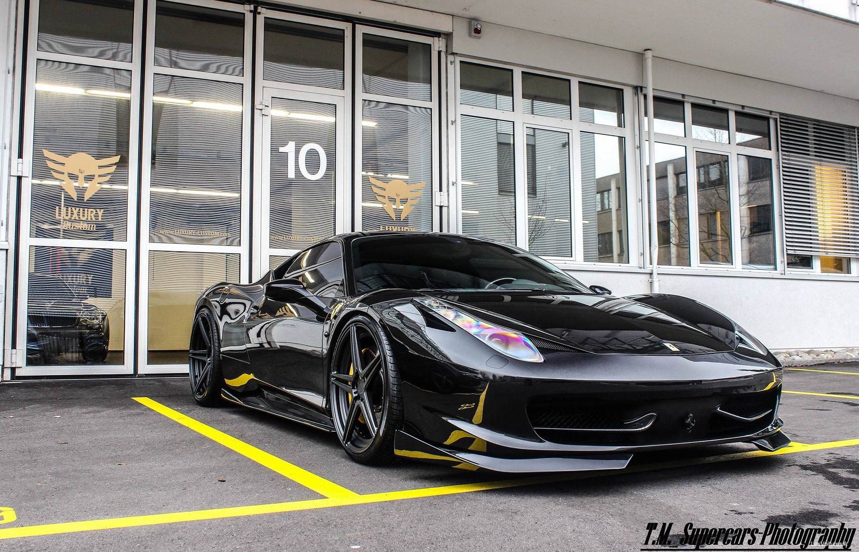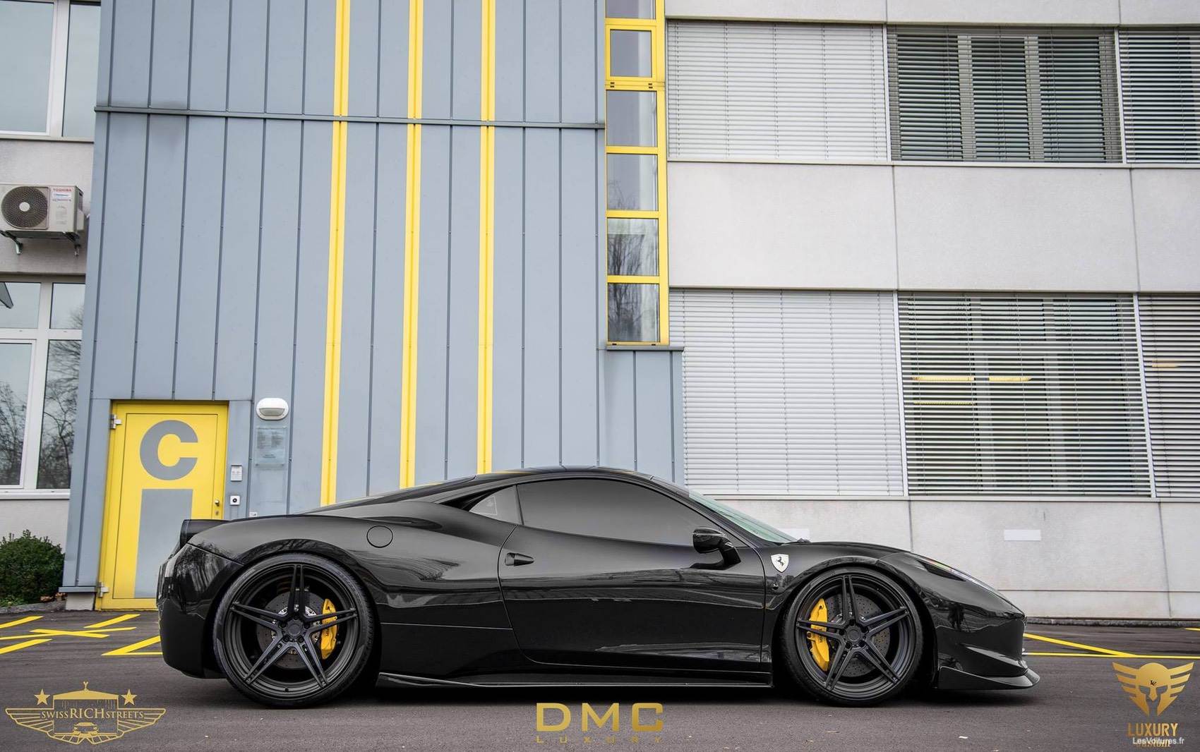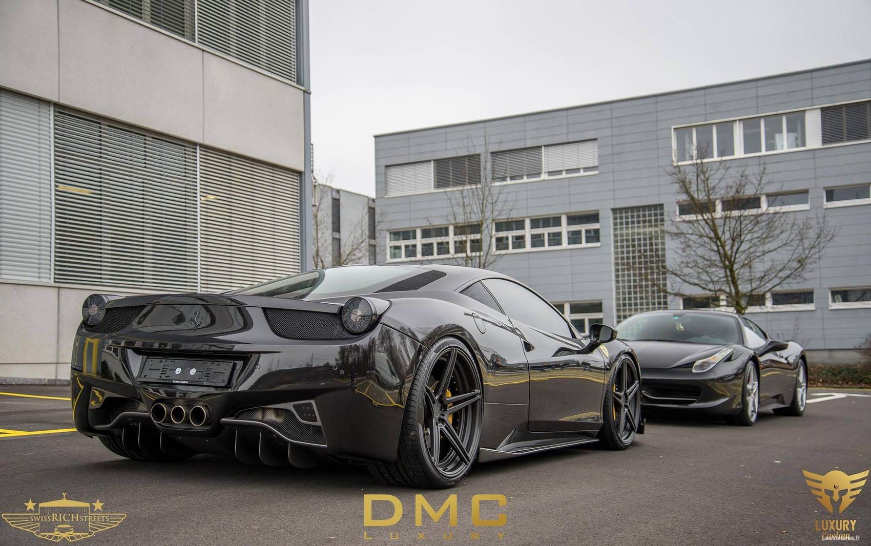 La teinte noire brillante qui recouvre même les feux arrière confère à la 458 DMC un rendu « méchant et agressif » ! Seuls les blasons Ferrari, les feux avant et les étriers de freins survivent à cette noirceur diabolique. Le kit carrosserie de la Ferrari revisitée comprend, entre autres, une lame avant, des bas de caisse effilés et de nouveaux feux. A noter que DMC s’est associé à Luxury Custom pour proposer cette nouvelle version de la Supercar italienne.