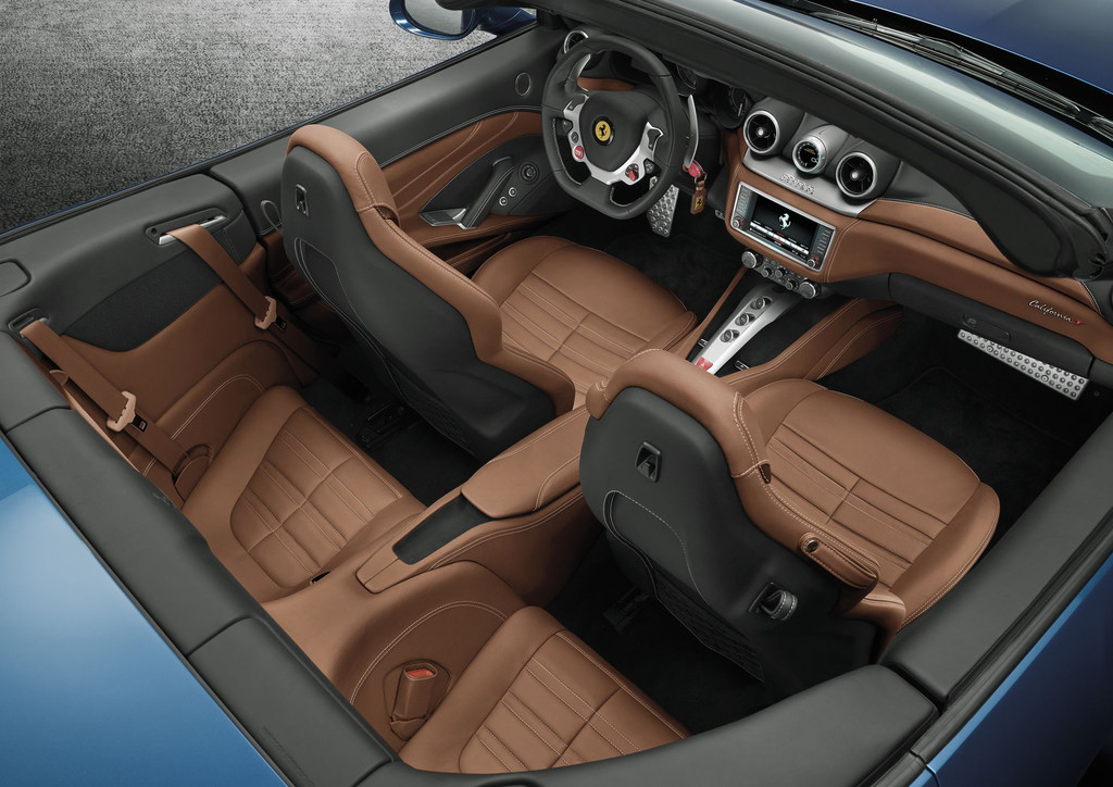 Sous le capot, c’est une véritable révolution à l’instar de tous les constructeurs automobiles car Ferrari a fait le choix du « downsizing ». Ainsi un 8 cylindres en V à 90 degrés de 3 855 cm3, remplace le précédent moteur de 4 297 cm3. La technologie aidant la puissance est en revanche considérablement augmentée grâce à deux turbos et la consommation est en baisse à hauteur de 20%. La nouvelle California T affiche 560 chevaux, soit un gain de 70 équidés. La Ferrari 458 Italia et ses 570 chevaux est à seulement 10 chevaux de la « petite » California. Le couple du bolide passe de 505 Nm à 755 Nm, 250 Nm supplémentaires, c’est stupéfiant ! La California T ne consomme que 10,5 l/100 km pour des émissions de CO2 de 250 g/km (gain de 49 g/km par rapport à l’ancienne version).