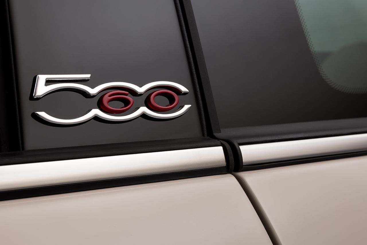 Pour marquer une certaine rareté, cette 500 arbore des logos « Fiat Vintage » à l’avant et à l’arrière ainsi que sur le volant. D’autres logos « 500-60th » sont situés sur les montants de portes, les jantes 16″ avec finition blanche et les coques de rétroviseurs chromées. Les jantes de 16″aux cache-moyeux chromés sont spécifiques comme les coques de rétroviseurs.