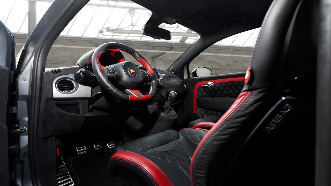 L’habitacle de la Fiat Abarth 500 Pogea est en parfait accord avec sa « robe extérieure » et son « cœur surpuissant ». On y trouve par exemple des sièges baquets en cuir.