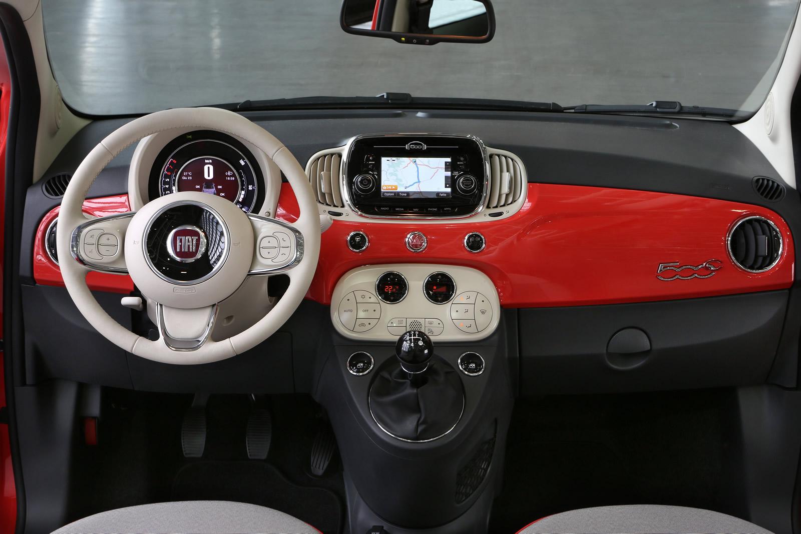 L’habitacle de la 500 profite de quelques retouches avec 10 possibilités de selleries. L’écran multimédia de 5″ (en série) est désormais situé en haut de la planche de bord. Le système Uconnect qui propose de multiples services connectés (TomTom, etc…) est bien sûr présent. Il est aussi possible de commander l’écran du tableau de bord 7″ à affichage numérique (à partir de la finition Lounge). Le autres finitions restent en analogique.