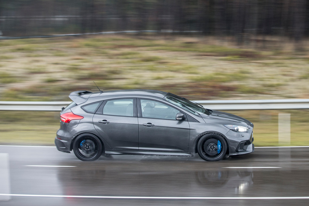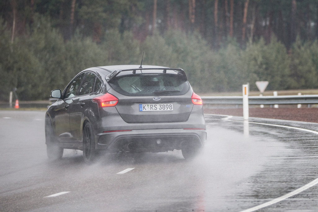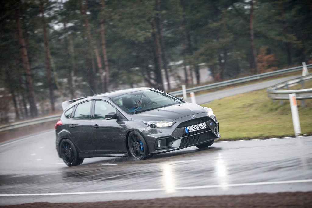 Sous la pluie, la Focus RS s’élance sur les chapeaux de roues ! On sent clairement que le pilote essayeur Ford maîtrise et connaît « plus que bien son sujet ». A l’intérieur, le bruit du moteur est à la fois contenu et enivrant. Quelques « bangs » d’échappements viennent percuter nos tympans pour notre plus grand plaisir. A l’attaque des premières courbes, on ressent instantanément le grip exceptionnel de la berline sportive.