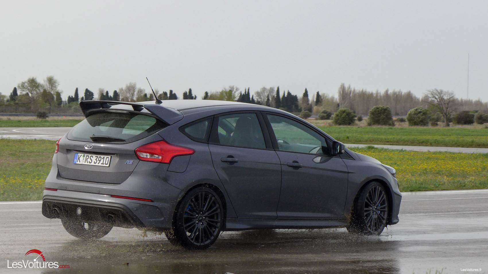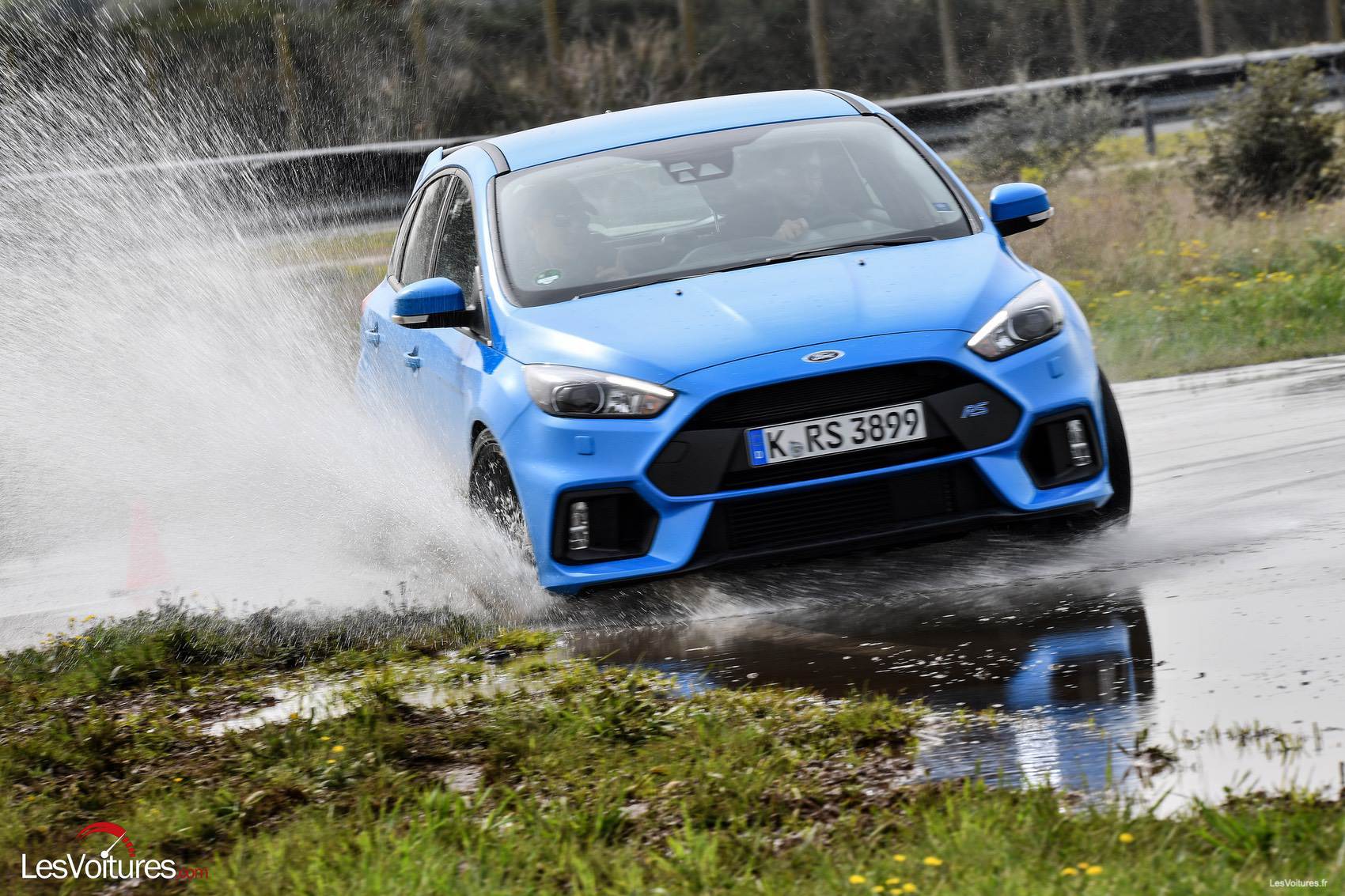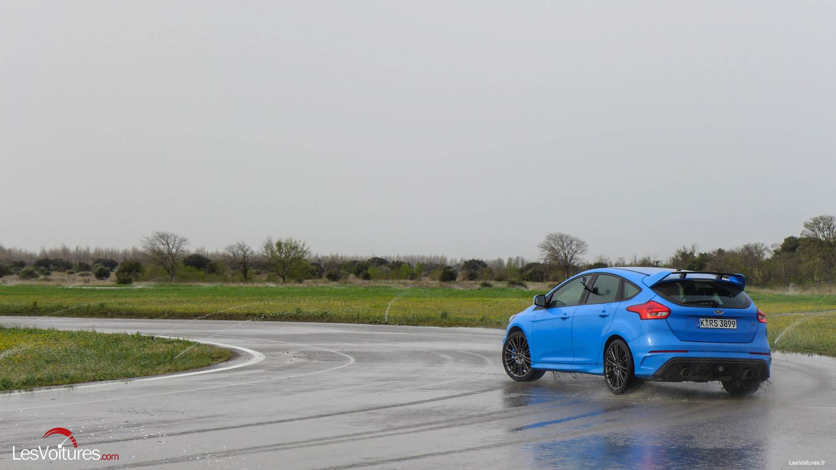 Ken Block a participé à son calibrage. L’épisode 4 de la série Rebirth of an Icon, qui nous fait vivre de l’intérieur et en totale transparence la conception de la Focus RS, met en exergue le travail du pilote américain (à voir sur : Vidéo : série « Renaissance d’une icône » consacrée à la Ford Focus RS, épisode 4, Ken Block se lâche !). Et à la limite de « cercle d’eau » que nous avons glisser, la preuve à travers la photo qui suit.