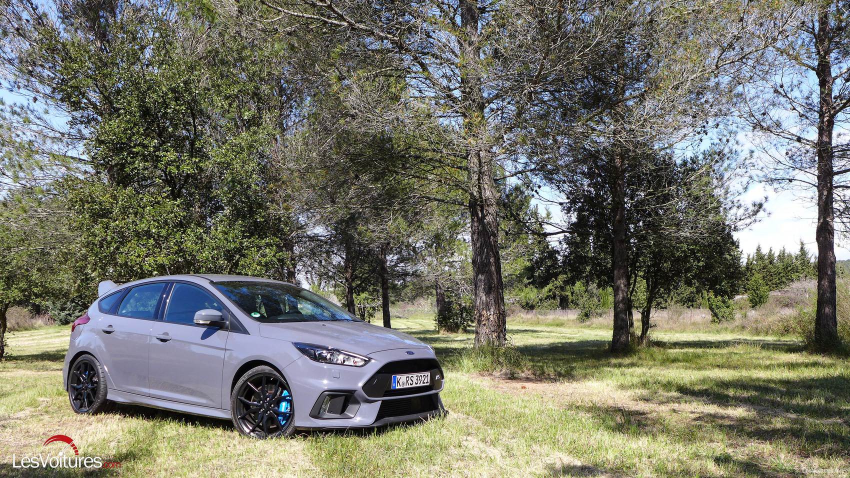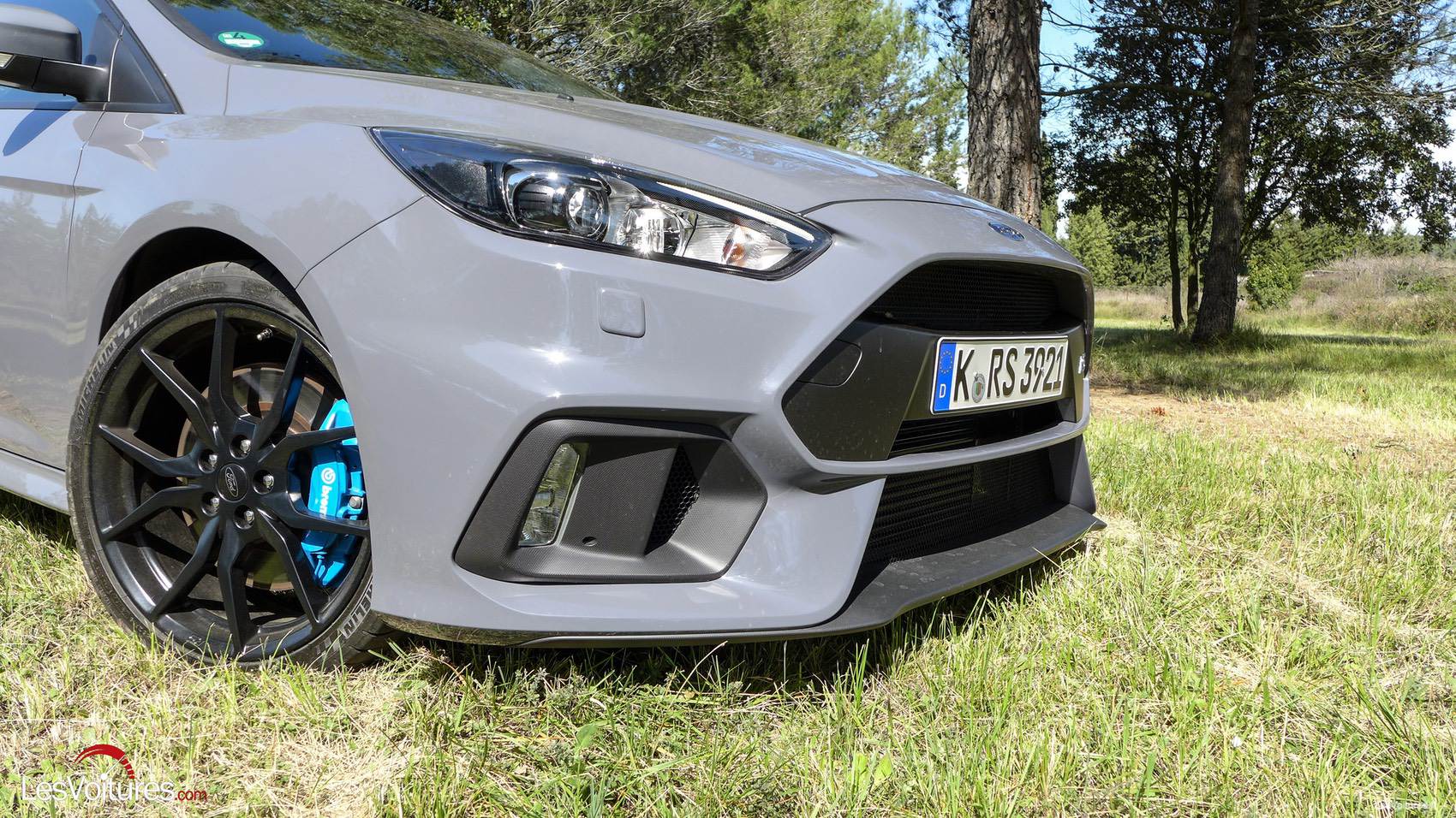 Le bureau de style Ford et les équipes de Raj Nair, vice-président, directeur technique en charge du développement, ont uni leur expertise pour développer également une aérodynamique optimale. Elle prend forme, entre autres, sous les lignes acérées du diffuseur avant de notre version d’essai de teinte Signature Gris Stealth (option : 900 €). Certes, peu de bleu Ford sur cette livrée originale mais elle colle parfaitement à la Focus RS en rappelant joliment la carlingue des avions de chasse américains. Les étriers de freins Brembo bleu, coloris optionnel (170 €), en ressortent davantage derrière les superbes jantes forgées noires de 19” (option : 1 000 €).