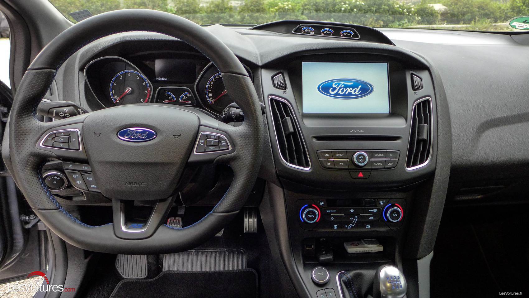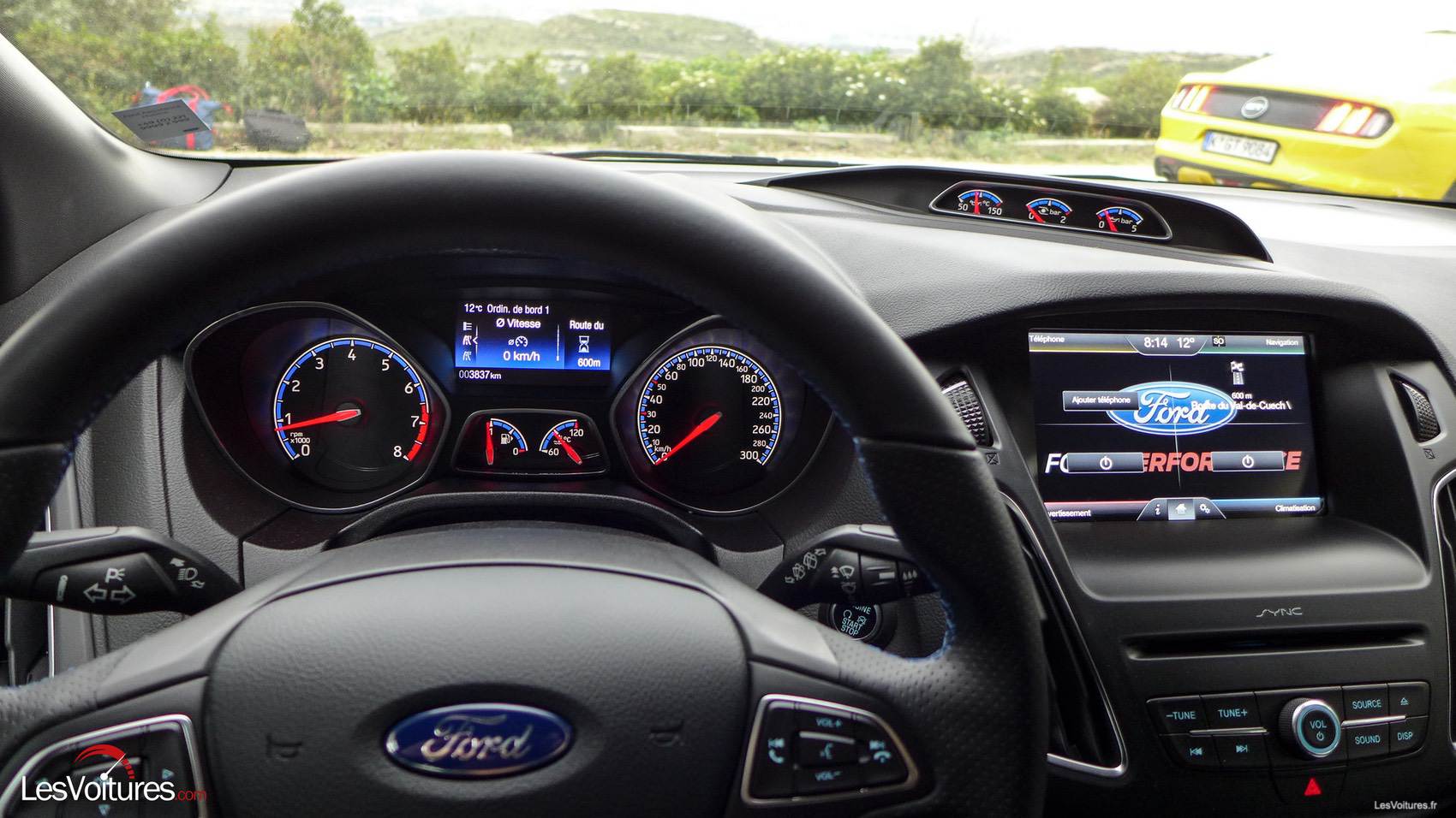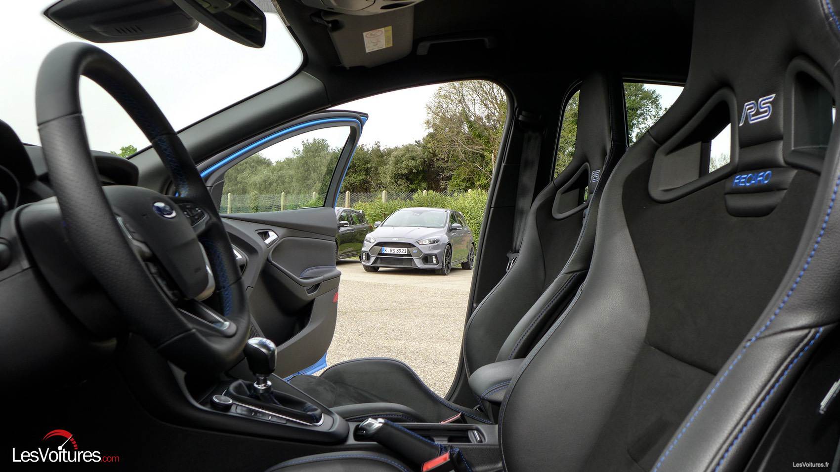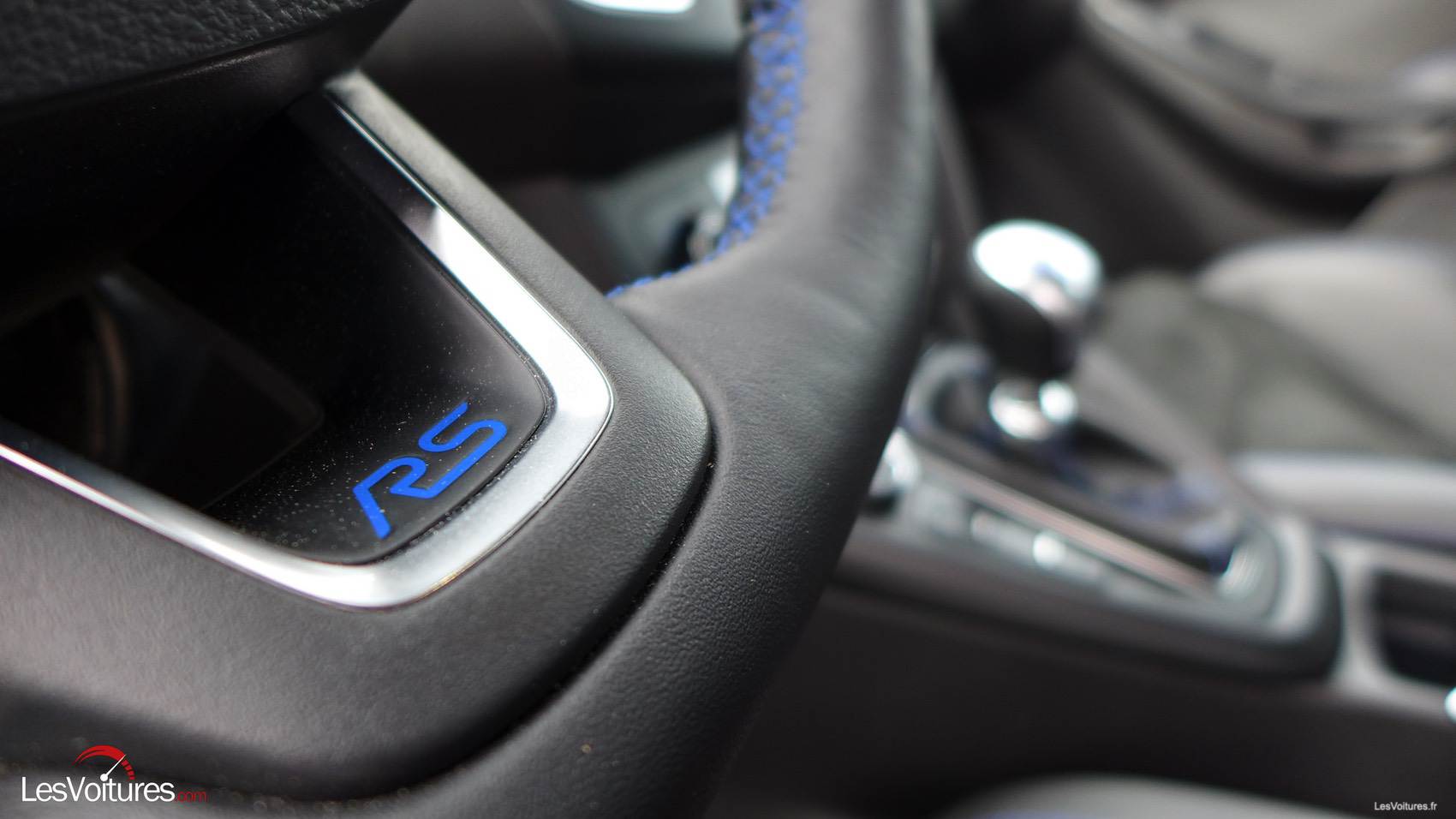 A l’intérieur, on se sentirait presque dans une Focus normale. Même si on aurait apprécié des inserts en carbone et d’autres éléments en aluminium, les tachymètres, qui sont situés sur la planche de bord, dégagent une indéniable ambiance sportive digne de la griffe RS. Griffe que l’on retrouve brodée sur les sièges semi-baquet Recaro, cette fois totalement en adéquation avec l’auto. Sans oublier les surpiqûres bleues qui parsèment le cuir.