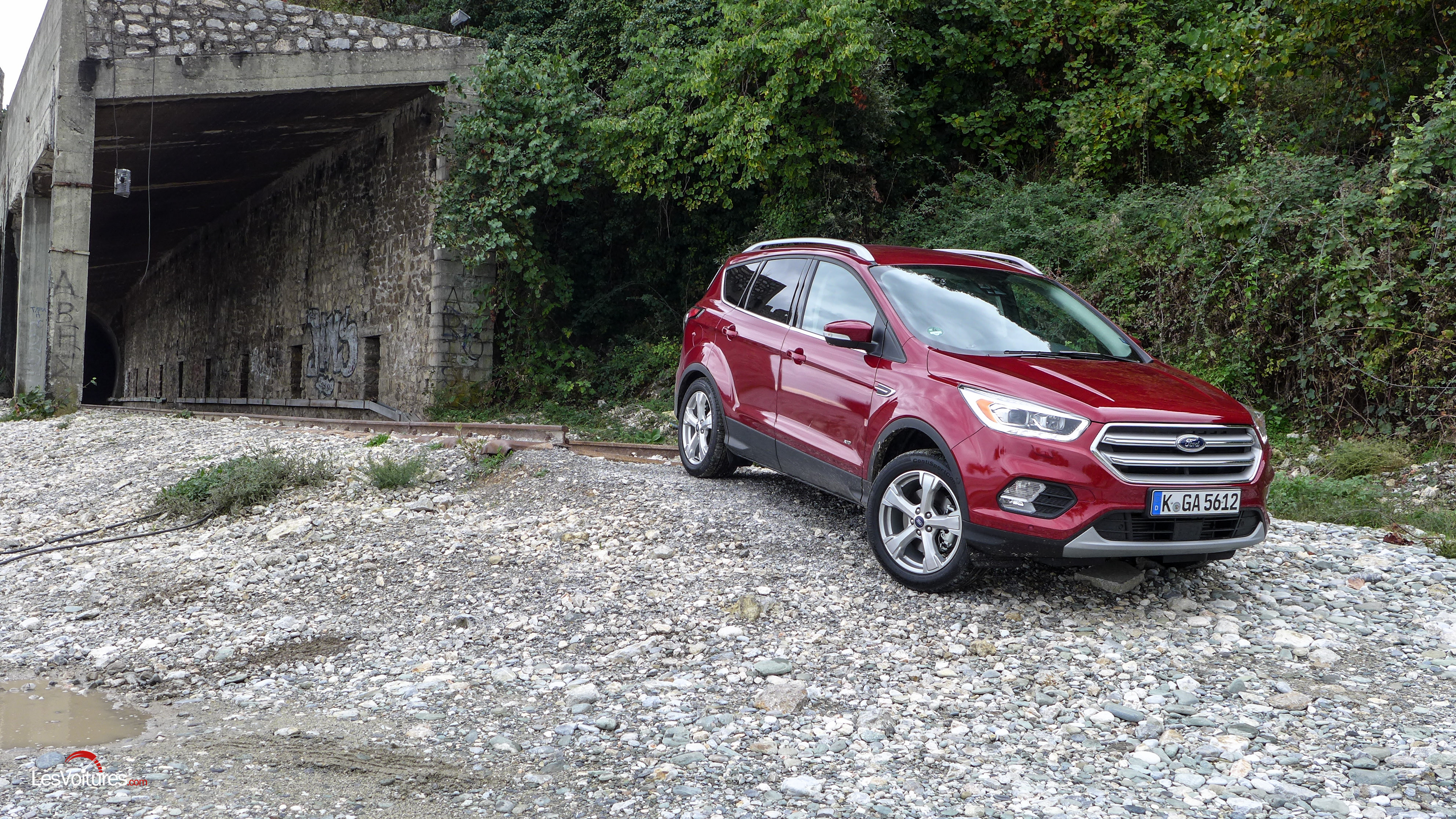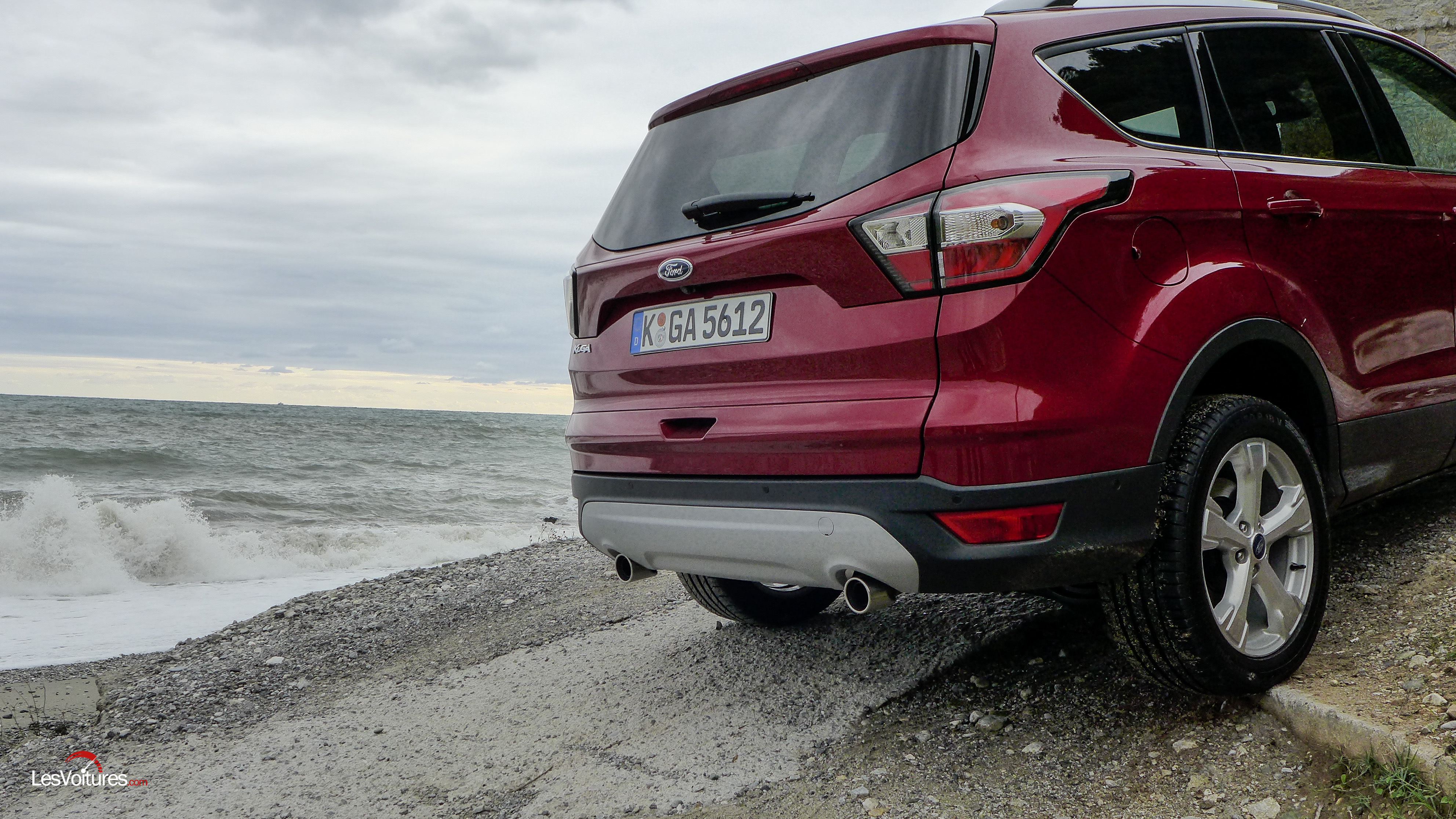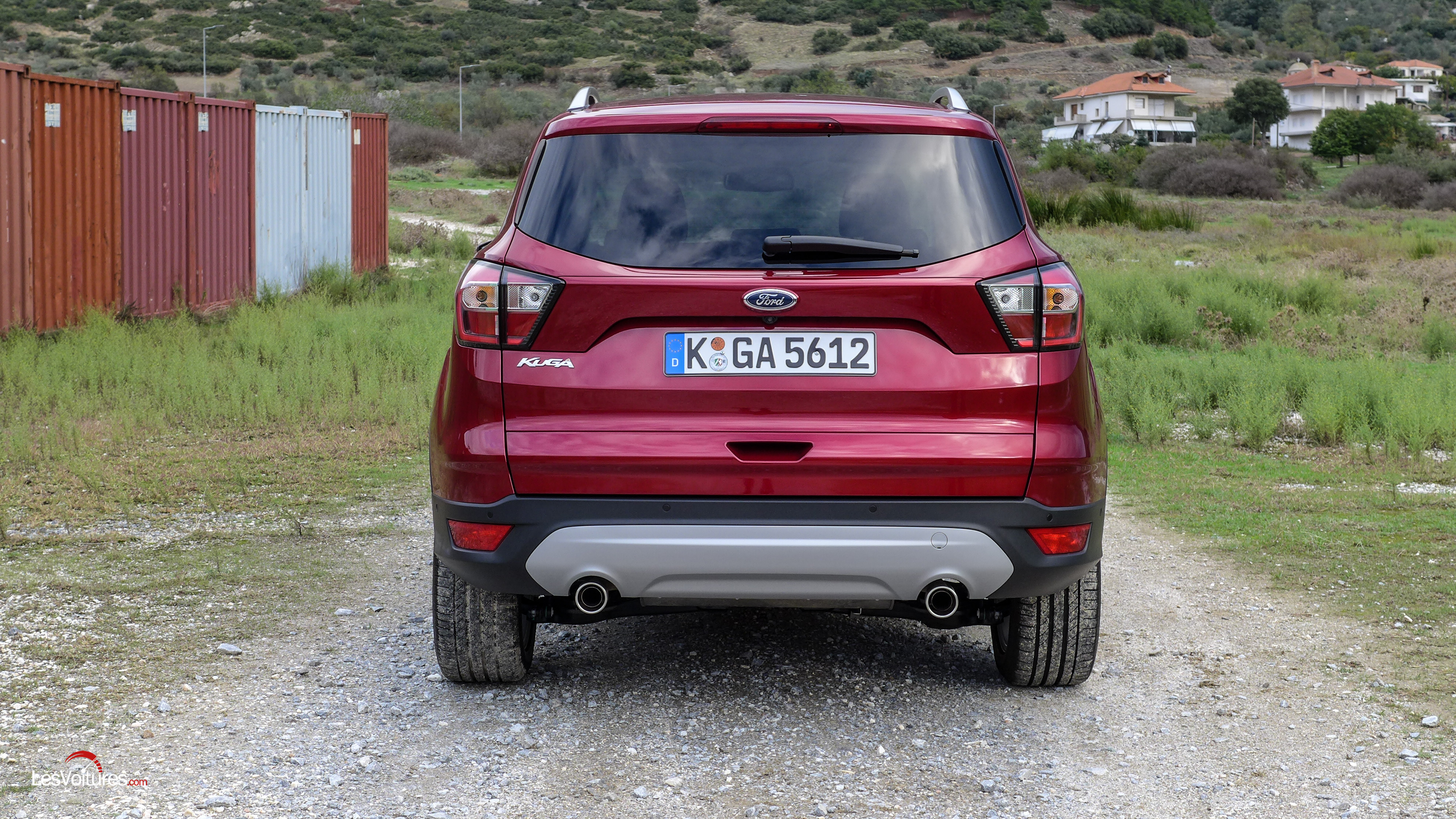 Sur le plan du style, le Kuga joue la carte de la sportivité robuste tout reprenant les derniers codes visuels chers à Ford dont la grande calandre trapézoïdale. A cela s’ajoutent de nombreuses évolutions : phares au dessin très effilé, feux antibrouillards intégrés, ailes musclées, diffuseur arrière. Grâce à elles, le Kuga développe une sérieuse impression de solidité et une sobriété élégante surtout dans sa finition Titanium, celle de notre modèle d’essai, qui, de surcroît, arbore une sulfureuse teinte rouge Rouge Candy (option). Point important, le SUV est l’un des plus long de sa catégorie avec 4,52 m mais pas le plus large, ce qui lui confère un aspect compact.