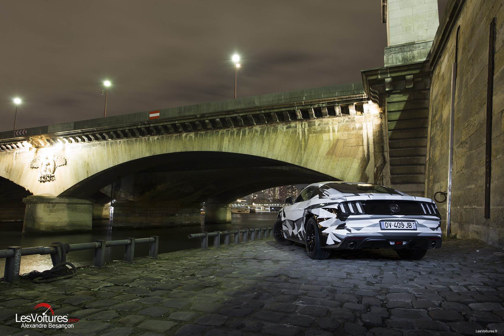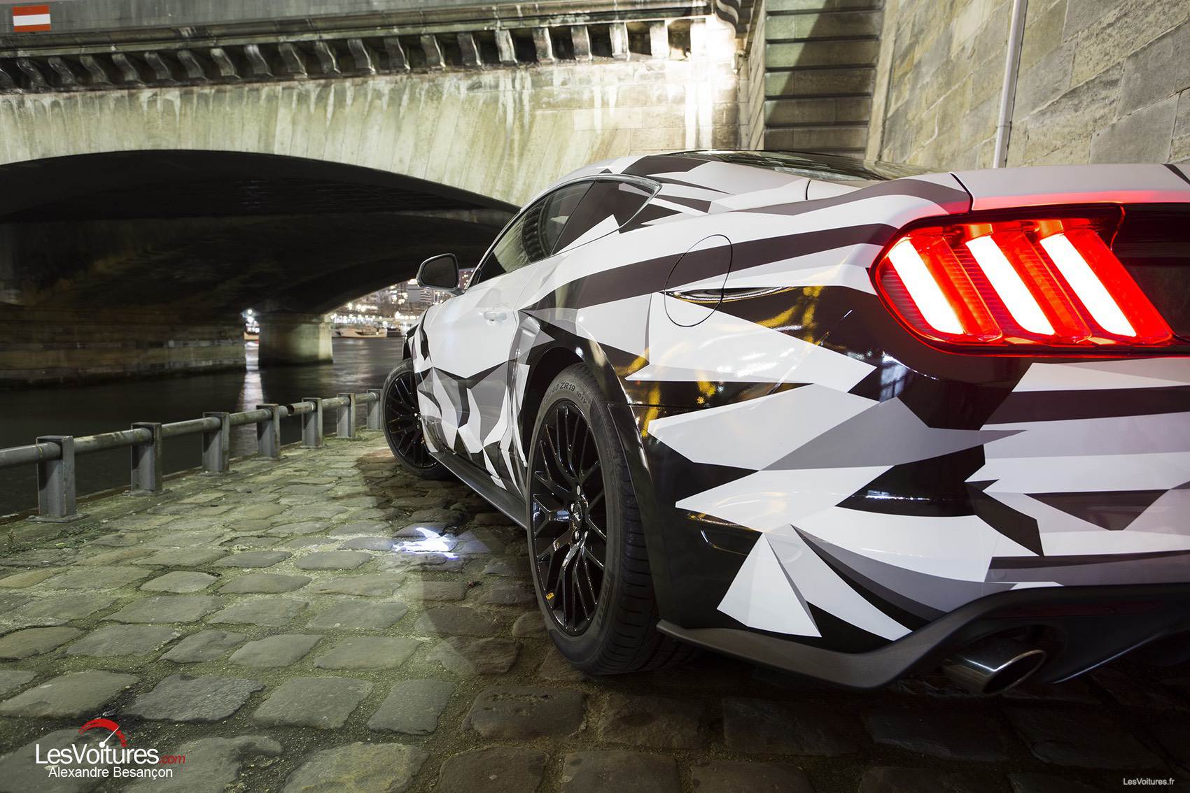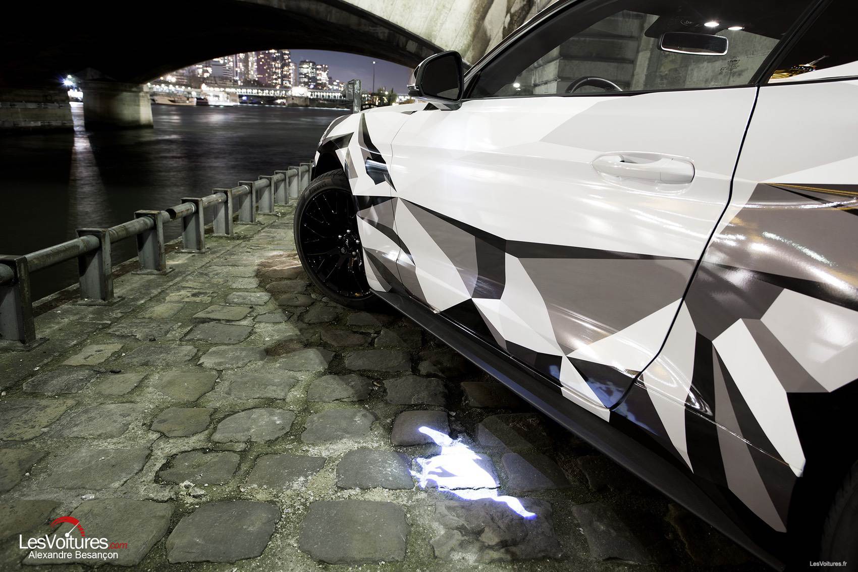 Autre ambiance, celle de la Carrosserie Lecoq par laquelle nous avons débuté notre « Paris by Night » en Ford Mustang. D’une atmosphère sombre et métallique à une autre hyper-lumineuse, la Ford Mustang GT équipée du V8 5.0 l (421 ch) et au wrapping sculptural, se révèle alors dans ses moindres détails. Sa « nouvelle gueule » ressort ainsi monstrueusement et son regard acéré nous envoûte. C’est Morgan Grosset, lui-même, qui a supervisé la réalisation de ce wrapping :