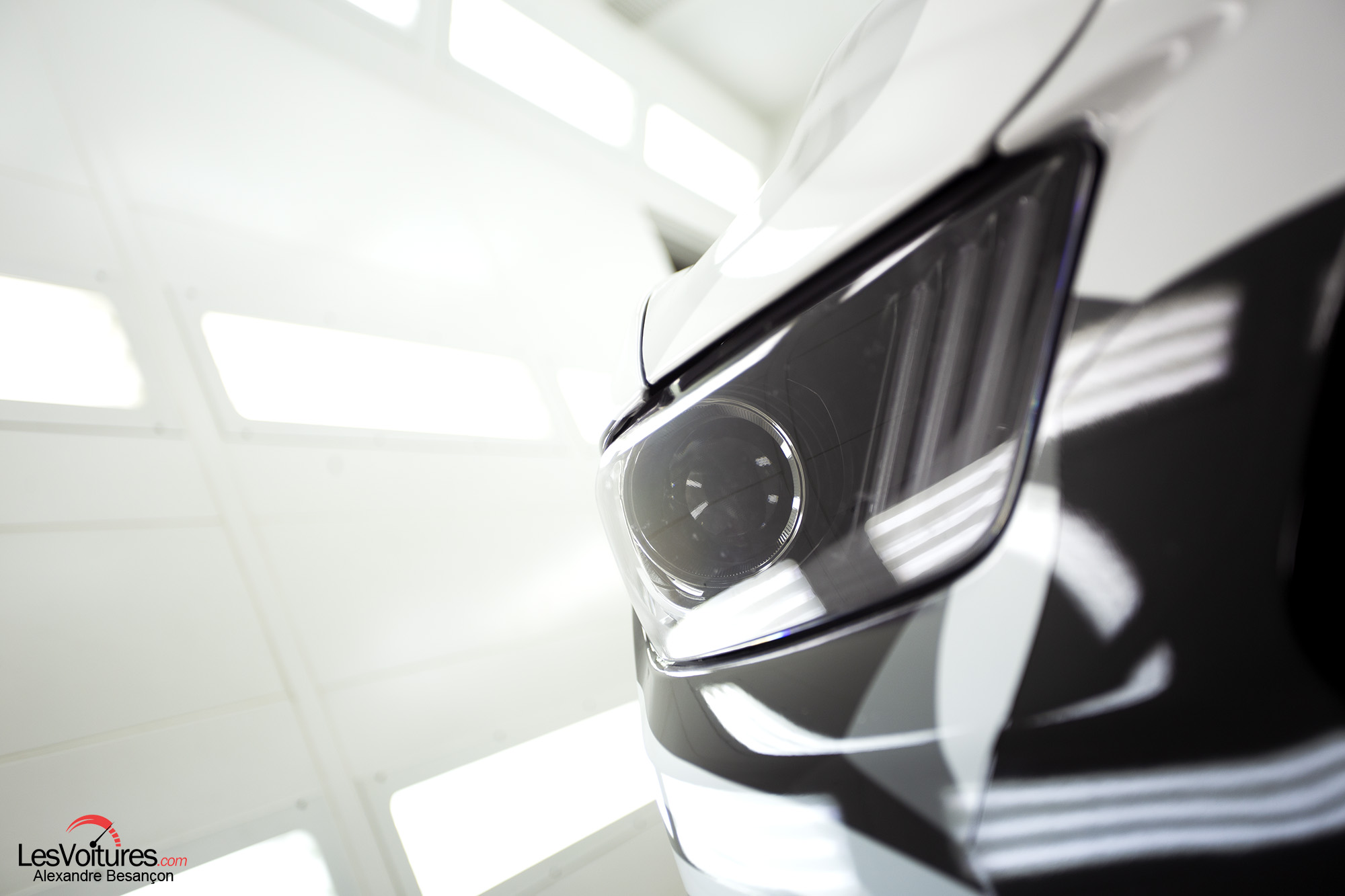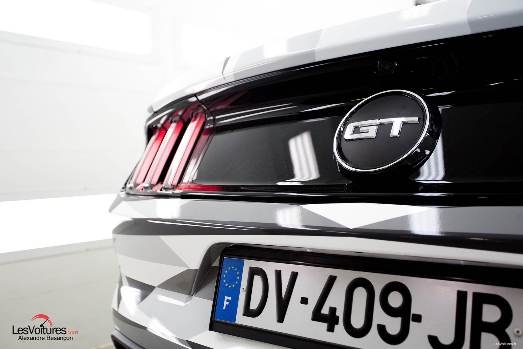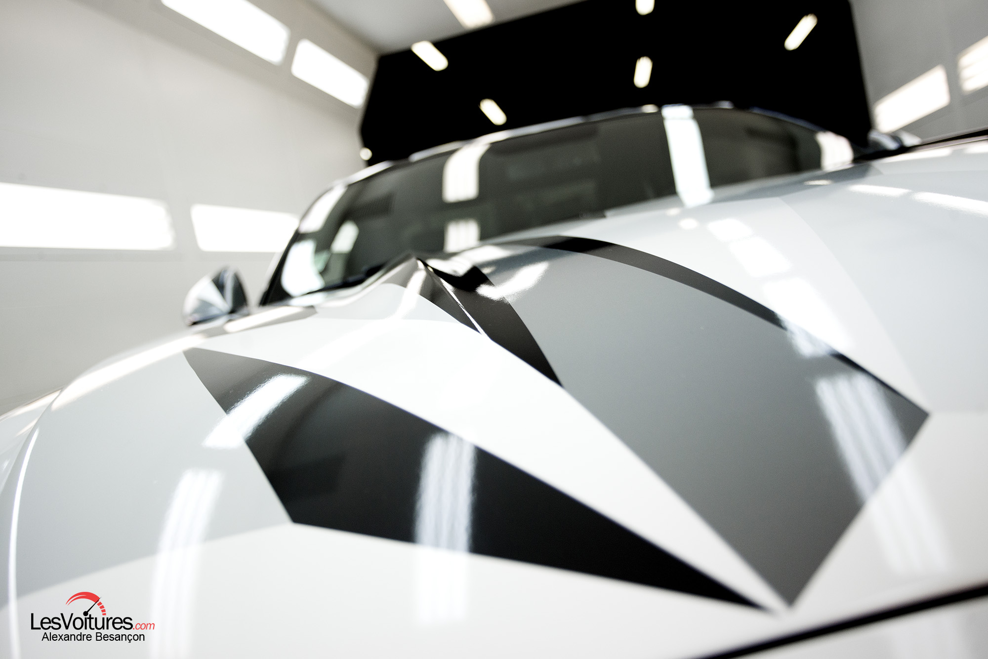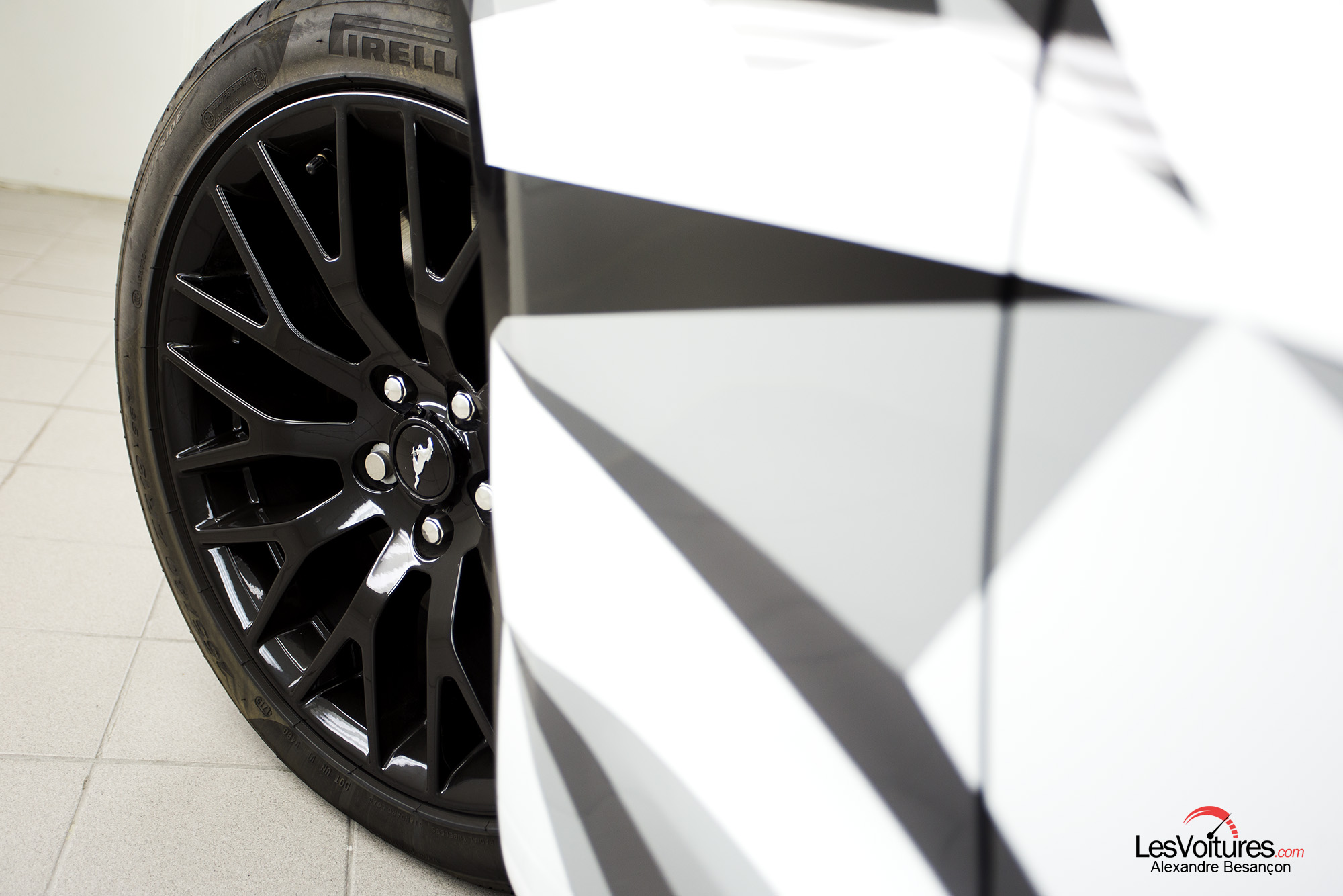 Autre ambiance, celle de la Carrosserie Lecoq par laquelle nous avons débuté notre « Paris by Night » en Ford Mustang. D’une atmosphère sombre et métallique à une autre hyper-lumineuse, la Ford Mustang GT équipée du V8 5.0 l (421 ch) et au wrapping sculptural, se révèle alors dans ses moindres détails. Sa « nouvelle gueule » ressort ainsi monstrueusement et son regard acéré nous envoûte. C’est Morgan Grosset, lui-même, qui a supervisé la réalisation de ce wrapping :