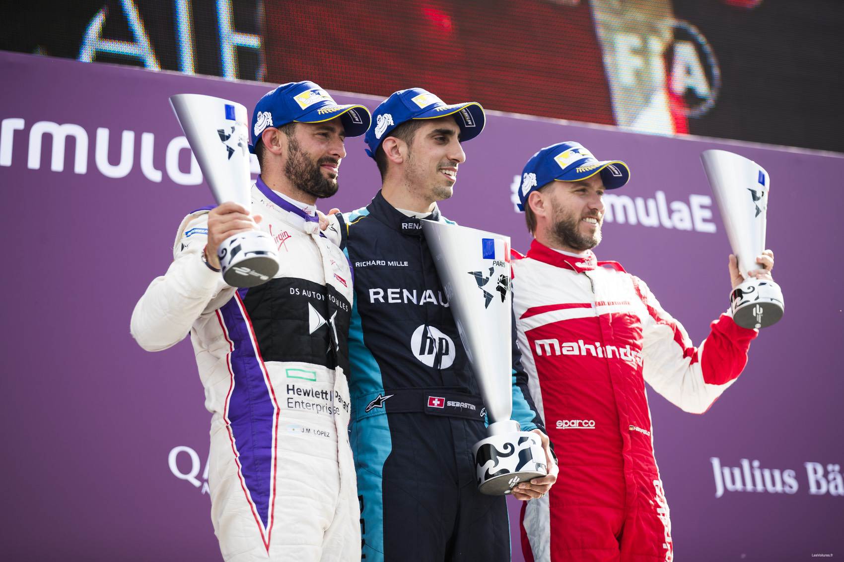 Nouveau rebondissement au 34ème lorsque Jean-Eric Vergne envoie sa monoplace dans le mur au niveau du rond-point de la place des Invalides, probablement à cause d’un problème mécanique. S’en suit, l’entrée en piste de la voiture de sécurité. 3 tours plus tard, la course est relancée. Alors, Buemi garde l’avantage sur Lopez et Nick Heidfeld (Mahindra Racing). Puis quelques instants après, Lucas di Grassi se loupe au freinage et termine dans les Tecpro du virage N°8. La BMW i8 Safety Car fait son retour immédiatement en piste pour garder derrière elle les pilotes dont les positions ne changeront pas jusqu’au drapeau à damier. A noter que Daniel Abt (ABT Schaeffler Audi Sport) n’a pas franchi la ligne d’arrivée suite à un problème technique. Quant à Nicolas Prost, il termine 5ème.