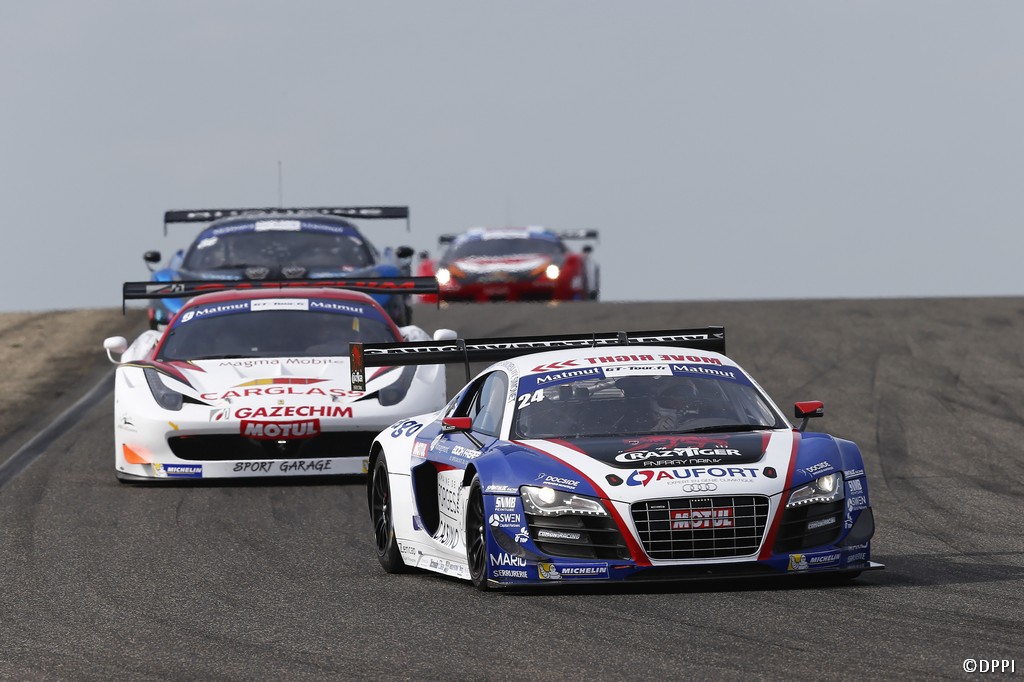 A l’extinction des feux, Philippe Giauque ne tremble pas et emmène la meute, tandis que David Hallyday cède temporairement la deuxième place. Il la retrouve quelques virages plus loin. Si la sagesse est de mise, les débats sont animés avec notamment les quatre voitures de tête regroupés en moins de deux secondes. Hallyday pense prendre la tête dans le neuvième tour, mais Giauque reprend son bien dans les mètres qui suivent. Les deux hommes vont petit à petit creuser l’écart – jusqu’à une dizaine de seocndes au bout de 20 minutes de course.- sur leurs poursuivants, la Ferrari/Sport Garage d’Eric Cayrolle et la Porsche/IMSA Performance-Matmut d’Olivier Pernaut. Suivent ensuite, dans cet ordre, l’Audi/Saintéloc #24 de Valentin Simonet, qui a distancé la Ferrari/Sport Garage de Maxime Piallat et la Ferrari/Team Duqueine de Bruno Strazze. Parti depuis la pitlane, Christophe Hamon est quant à lui revenu au huitième rang au moment des premiers arrêts au stand.