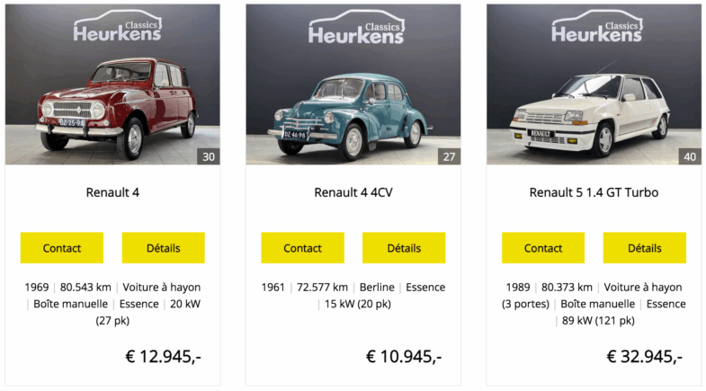 Heurkens Classics ne néglige pas les passionnés de voitures anciennes. Parmi les annonces récentes figurent une 4CV (1961), une R16 de 1966, une R4 (1969), toutes proposées entre 10 000 et 15 000 €. A noter qu’une Renault 8 (1969) vient d’être vendue pour 10 945 €. En cliquant sur l’image située ci-dessous, vous aurez directement accès aux offres Heurkens Classics.