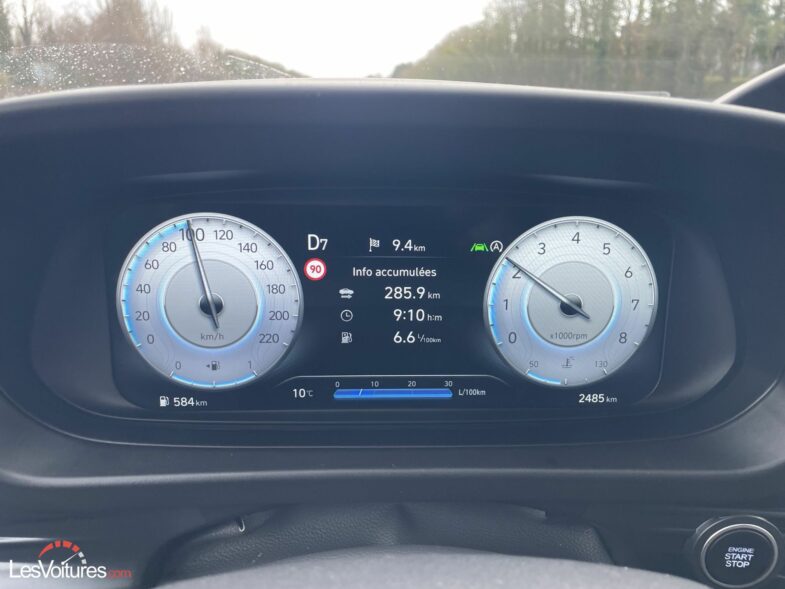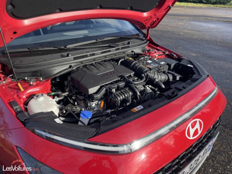Le moteur 1.0 T‑GDi 100, associé à la boîte DCT‑7, développe une puissance suffisante pour un usage polyvalent, même si son absence d’hybridation le pénalise légèrement en consommation urbaine. Ainsi, lors de notre test de consommation du plus grand et plus cher Hyundai Kona Hybrid de 129 ch, nous avons relevé un excellent 5,6 l/100 km de consommation moyenne en ville, contre 6,6 l/100 km pour le Bayon à essence.