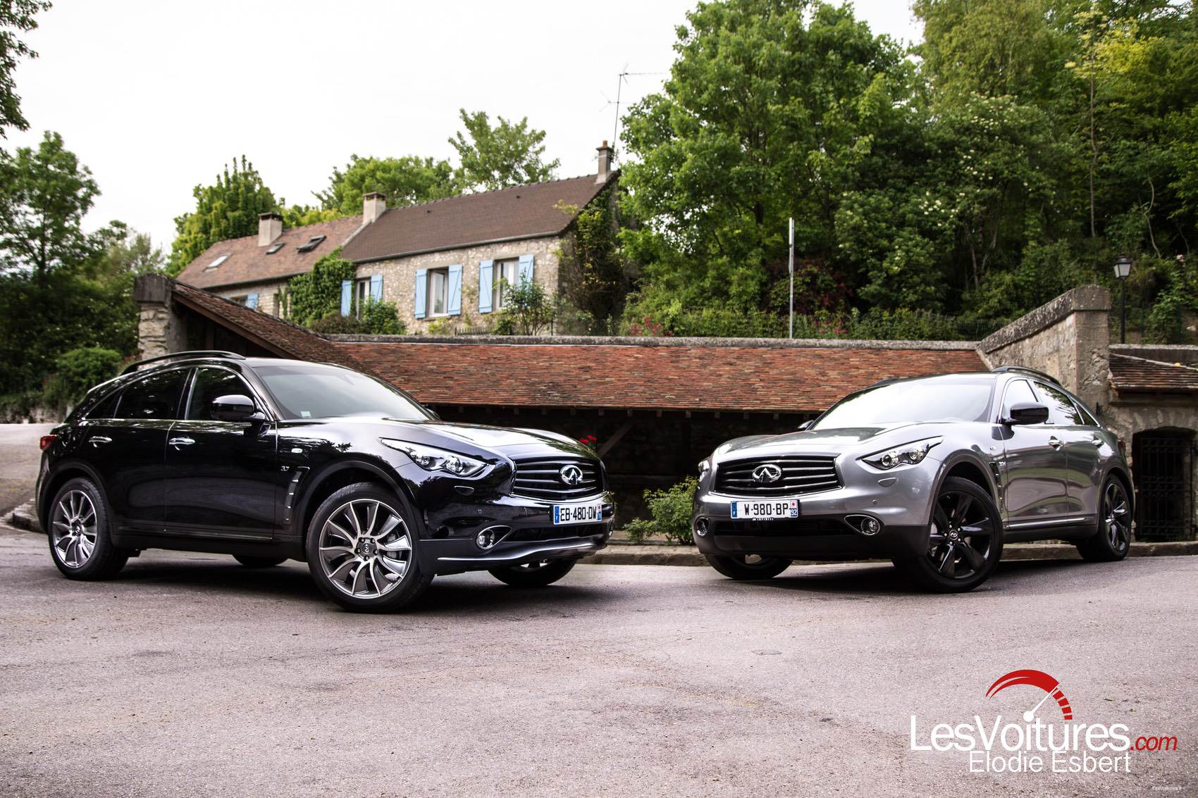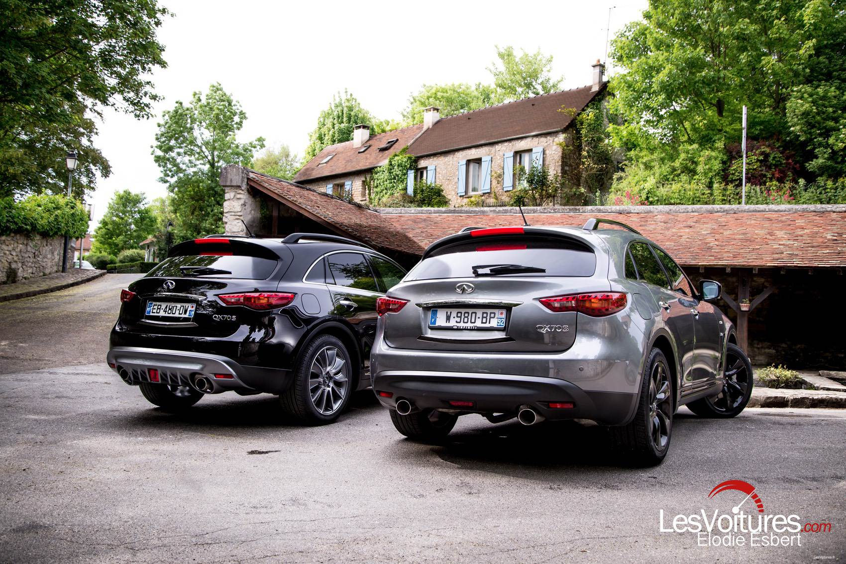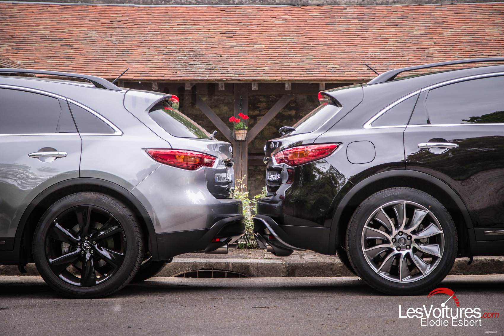 Cette identité sportive indéniable à laquelle nous avions pu goûter avec le V6 3,0 l Diesel de 238 ch (à lire sur : Infiniti QX70S Design : rencontre du 3ème type automobile…) ne fut que confirmée lorsque nous avons découvert les joies du V6 3.7 l essence de 320 ch (consommation : 9,8 l/100 km en cycle mixte). Ce nouveau cœur répondant aux normes Euro 6 donne un caractère bien plus trempé et dynamique à la bête. Les deux version S Design et Ultimate ont, à l’occasion de notre essai, pris la pose ensemble.