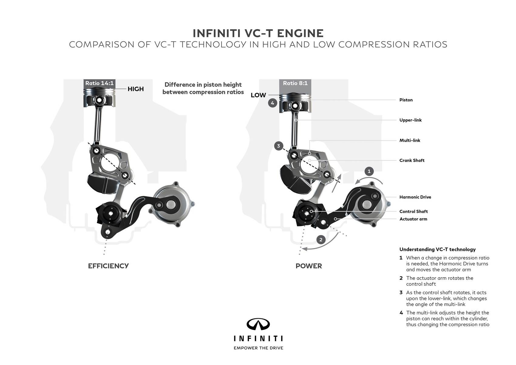 Concernant le principe de fonctionnement de ce moteur à compression variable, exit la base de la bielle et son chapeau. Ces éléments sont remplacés par un dispositif « multilink » à angle variable grâce à un bras désaxé. L’ensemble est situé autour du vilebrequin. La pompe qui est située à l’extérieur du moteur permet donc d’offrir une course variable au piston. Cela engendre un taux de compression qui peut évoluer sur un ratio compris entre 8:1 et 14:1 pour respectivement des performances optimales à plus d’efficacité en matière de consommation de carburant. Cela fait du moteur VC-T une redoutable concurrence face aux moteurs diesel.