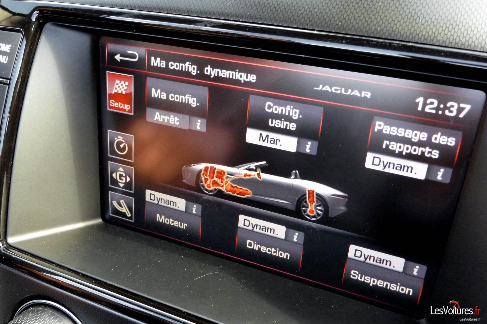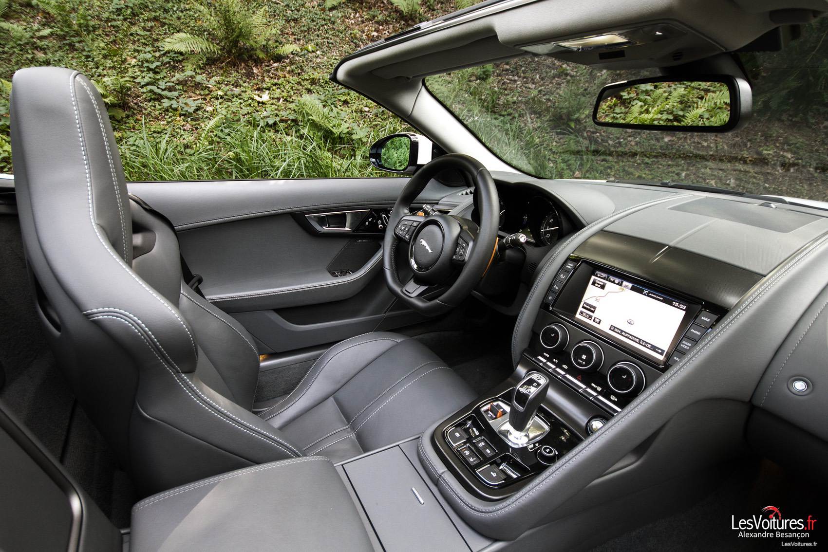 La F-TYPE V6 S propose 380 chevaux soit 40 unités supplémentaires par rapport à la version de base. La plus bestiale de la gamme est la V8 qui développe 495 chevaux. Le pedigree du félin V6 S affiche le 0 à 100 km/h en 4,9 sec, une vitesse maximale de 275 km/h. Tout l’intérêt du modèle V6 S porte sur ses capacités dynamiques améliorées et sa consommation raisonnable : 12,8 l/100 km en ville, 7,0 l/100 km sur autoroute et 9,1 l/100 km en cycle mixte. Pour finir sur les chiffres de la F-TYPE V6 S, elle est affichée à 85 400,00 € (hors options), la F-TYPE de l’essai à 105 850,00 € (nous tenons à votre disposition la liste des options, contactez-nous sur notre page facebook : LesVoitures.com).