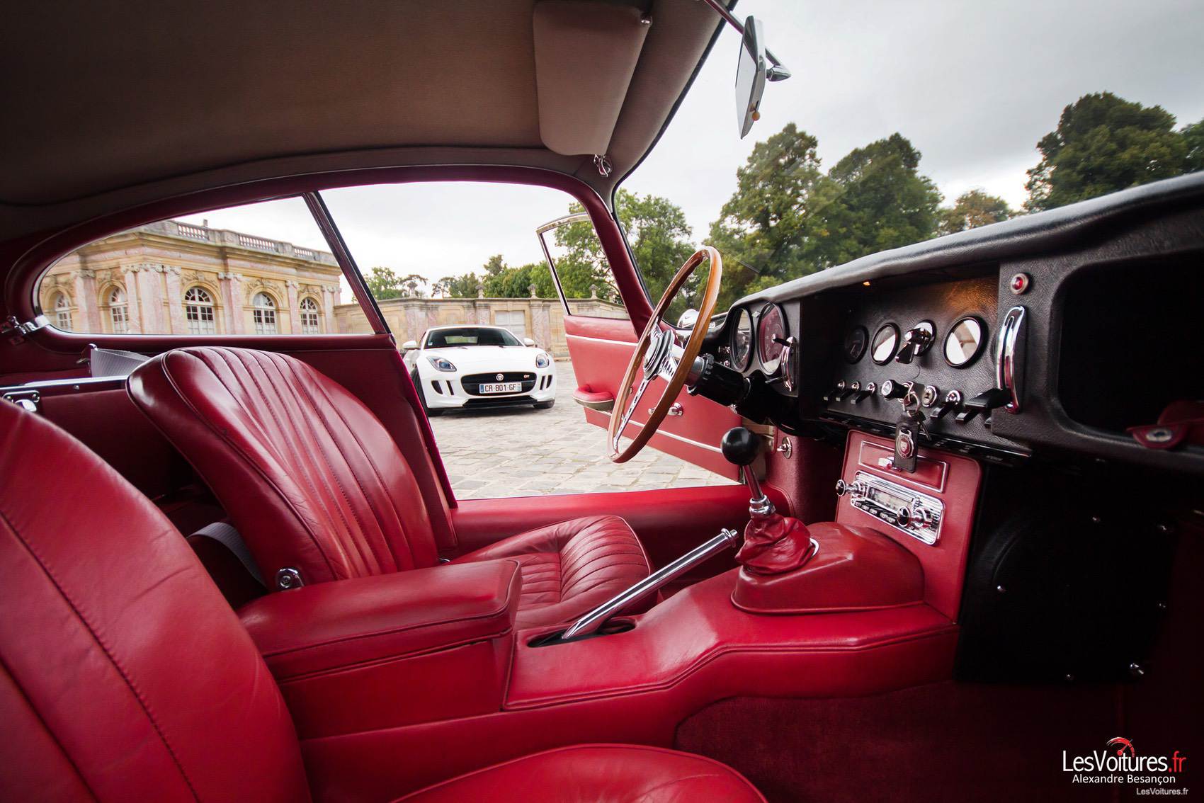 Nous sommes même en présence d’un exemplaire extraordinaire d’authenticité en parfait état. Vincent, son heureux propriétaire peut en être fier. Cette Type E de 1967 est l’une des dernières Série 1 produite. Elle est motorisée par un bloc de 4,2 l de 265 chevaux (officiellement). La belle de 67 a même participé au Festival of Speed de Goodwood ! L’intérieur du Coupé est 100% d’origine, en cuir rouge. Le cliché qui suit n’est pas une simple photo mais un tableau. Porte conducteur ouverte, la Type E semble offrir à la F-TYPE ses souvenirs d’antan.