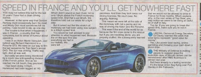 Sur une portion d’autoroute alors limitée à 90 km/h, où comme par hasard se trouvait un radar, les plus célèbres des contrevenants de ces dernières semaines se sont vus confisquer leur permis sur le champ ! Jeremy Clarkson était alors à 141 km/h et Richard Hammond à 143 km/h. Sans la présence de l’équipe de production de Top Gear, les deux stars de la télé auraient été tout simplement abandonnées sur notre beau territoire. Beau certes, mais la France n’a hélas pas du tout l’esprit « Top Gear » mais plutôt l’esprit « Ultra-répression »… Jeremy Clarkson a raconté cette pénible expérience dans sa tribune du Sunday Times (ci-dessous).