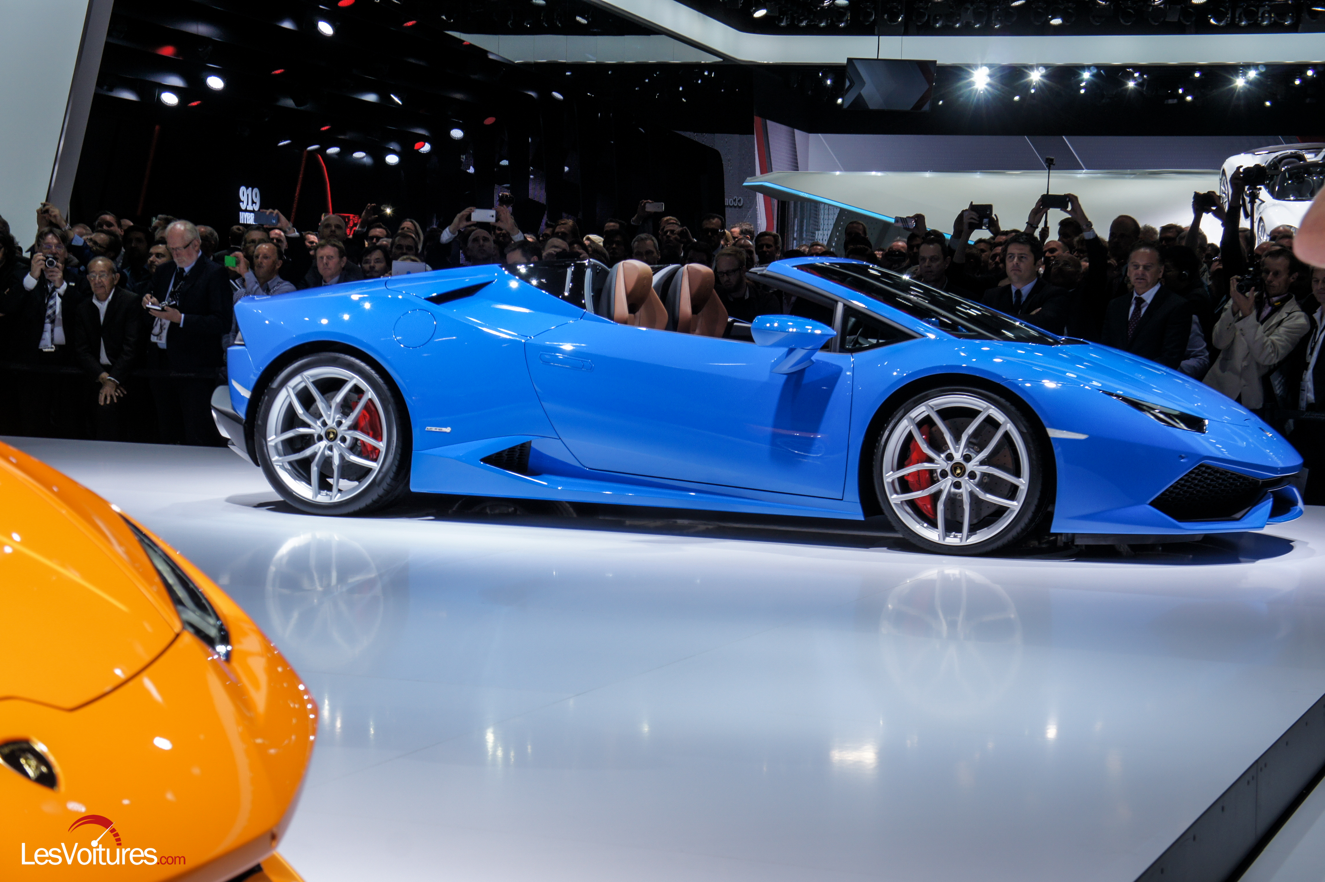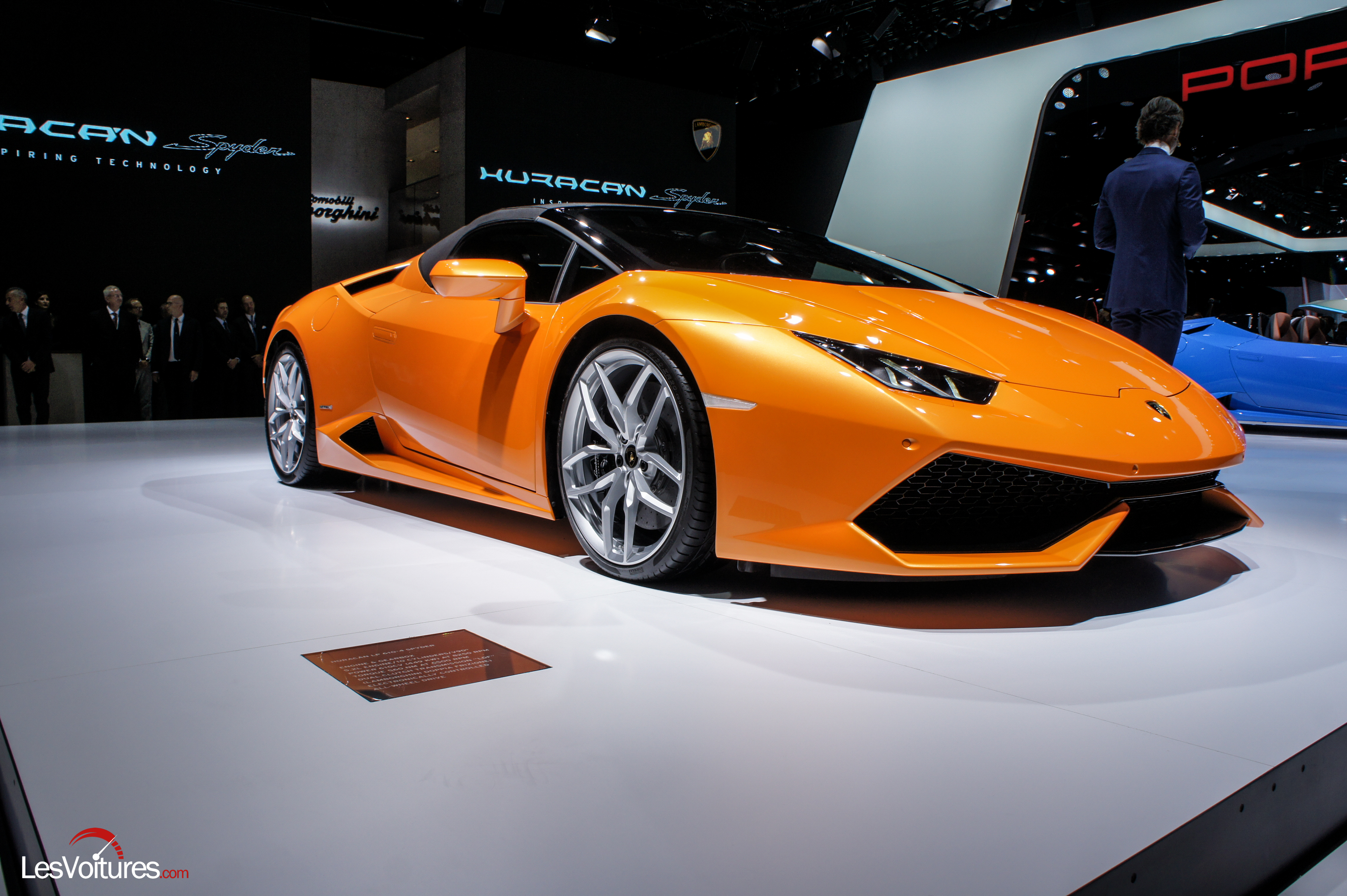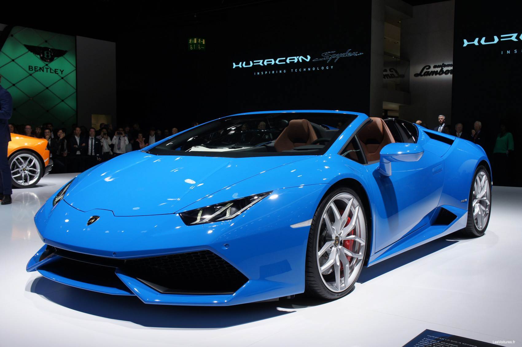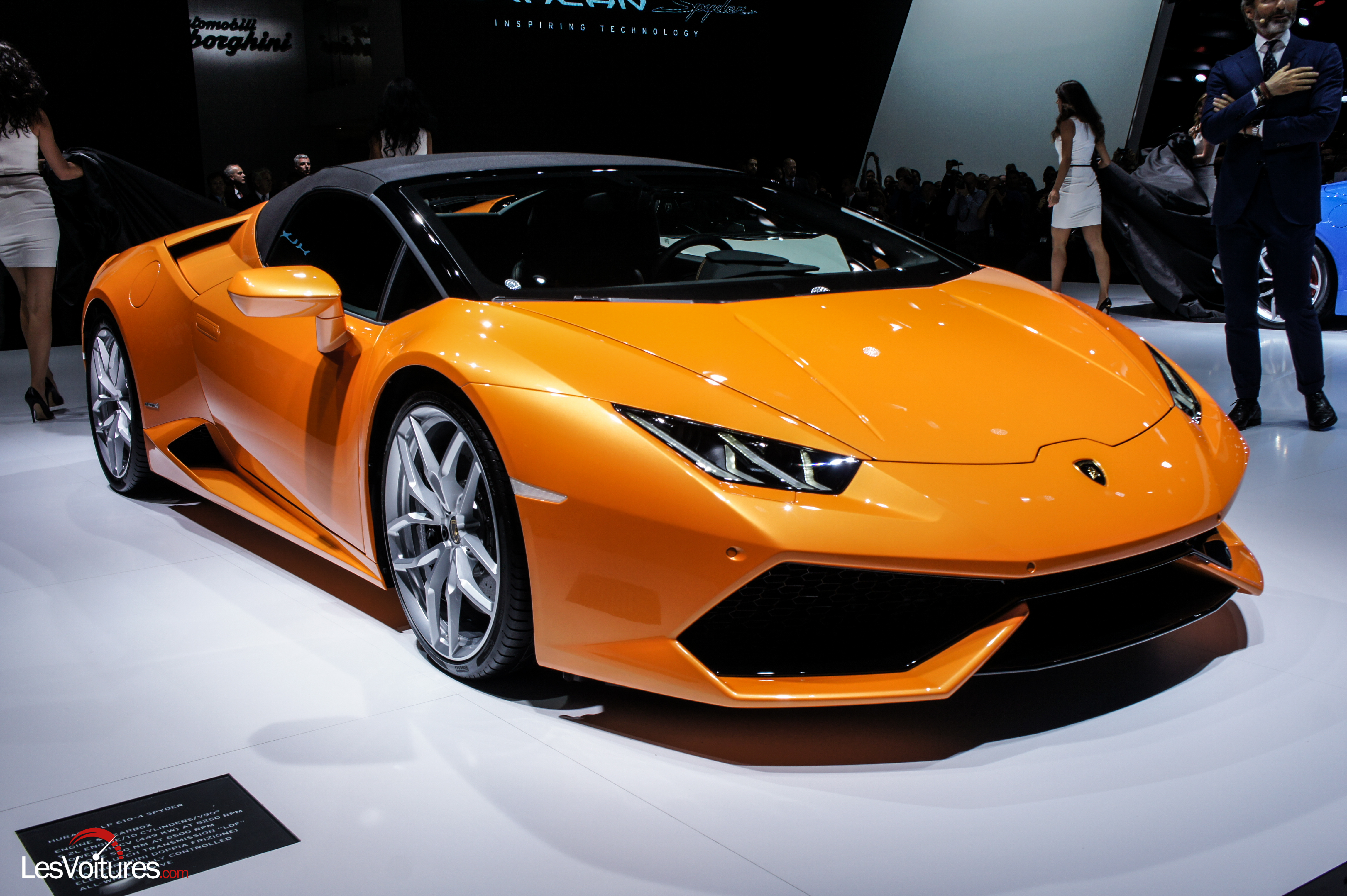Pas de surprise mécanique : la Huracán LP 610-4 Spyder reprend exactement le même V10 que sa version coupé. Le 0 à 100 km/h est annoncé en 3,2 s, le 0 à 200 km/h en 10 s. La vitesse de pointe sera de 324 km/h. Espérons vivement que les courageux qui pousseront l’auto jusque-là auront fermé le toit, au moins par respect pour leurs passager(e)s qui risqueraient d’y perdre tout investissement récent chez le coiffeur. La transmission intégrale est évidement de la partie, couplée à une boite automatique à 7 rapports, comme sur le coupé. De tous ces chiffres, la Lamborghini Huracán LP 610-4 Spyder Spyder tire son nom de code : LP 610-4, 610 pour la puissance et 4 pour quatre roues motrices.