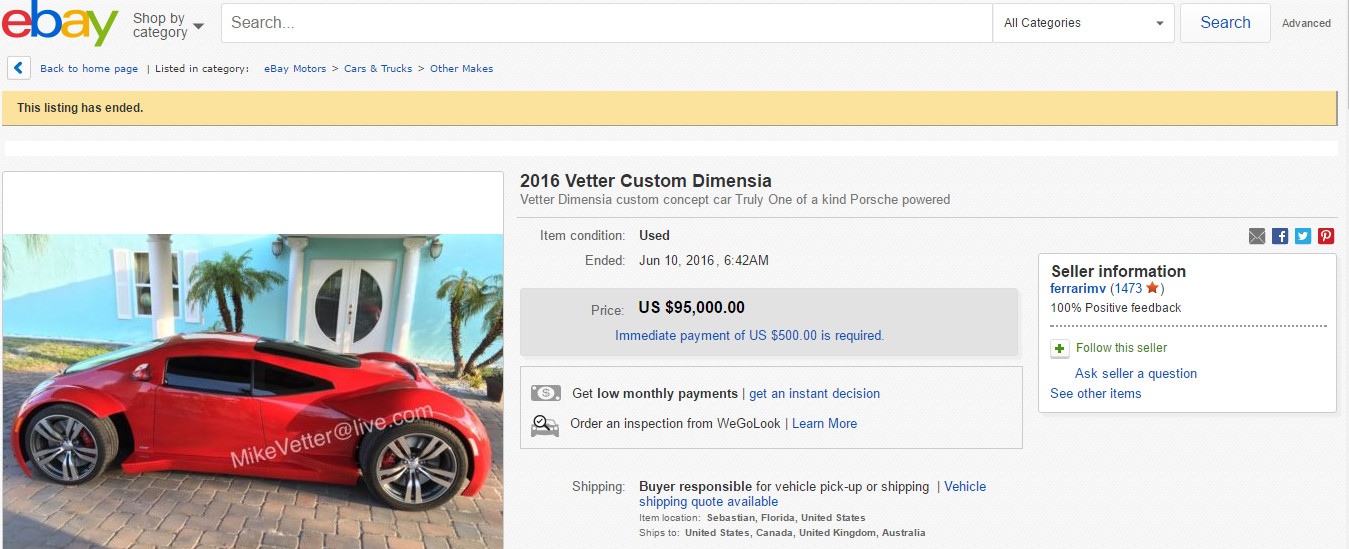 Mike Vetter, un américain très passionné par Minority Report, sorti au cinéma en 2002, a tenté de vendre une réplique de la Lexus 2054 du film. Baptisée Vetter Custom Dimensia, cette création très personnelle et originale n’est pas l’exacte copie de la voiture futuriste du film mais avouons que le travail réalisé est plutôt réussi. La voiture qui est habillée d’un rouge Ferrari est motorisée par un V6 2.7 l d’origine Porsche. D’ailleurs, la majorité des pièces qui composent cette réplique sont d’origine Porsche. Proposée sur eBay à 95 000 $, soit environ 84 000 €, cette Vetter Custom Dimensia n’a hélas jamais trouvé preneur, sûrement à cause du prix demandé. Son concepteur était pourtant prêt à l’échanger contre une Chevrolet Corvette C6 qui aurait était transformée pour un autre projet. Même Tom Cruise, Colin Farrell ou encore Steven Spileberg, le réalisateur de Minority Report, ne se sont pas manifestés.