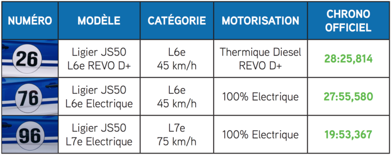 Voici un record insolite qui fait du bien tout en rappelant aux jeunes générations que le nom « Ligier » fait partie du patrimoine du sport automobile français. Ainsi, deux voitures sans permis (quadricycles électriques) Ligier JS50 Revo D+ (L6e – diesel) et JS50 100% électrique (L6e) ont été envoyées sur le tracé allemand du Nürburgring pour y établir des records. Une troisième Ligier JS50 (L7e), cette fois nécessitant un permis de conduire pour en prendre le volant, était aussi de la fête.