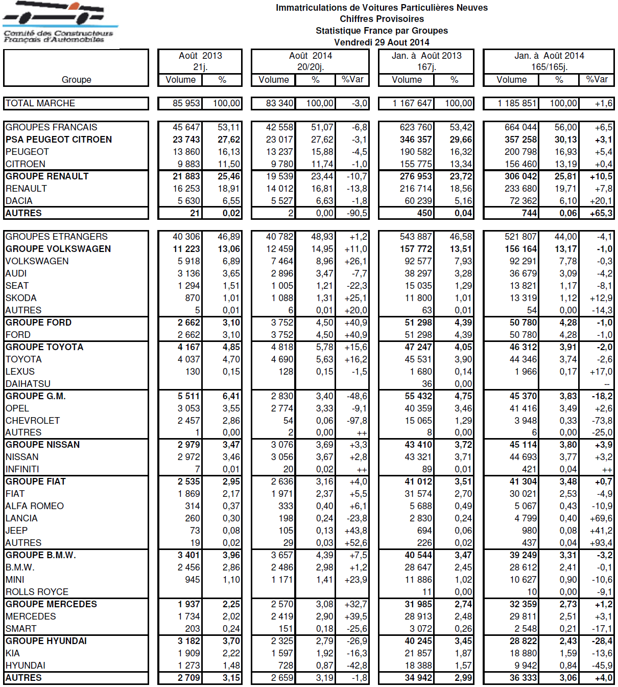 Les ventes de voitures de PSA Peugeot Citroën ont diminué de 3,1% en août, à 23 017 unités (-1% pour Citroën, à 9 780 unités, et -4,5% pour Peugeot, à 13 237 unités), et celles du groupe Renault de 10,7%, à 19 539 unités (-13,8% pour la marque Renault, à 14 012 unités, et -1,8% pour Dacia, à 5 527 unités). Cette fois, la marque low cost ne sauve pas le groupe Renault.