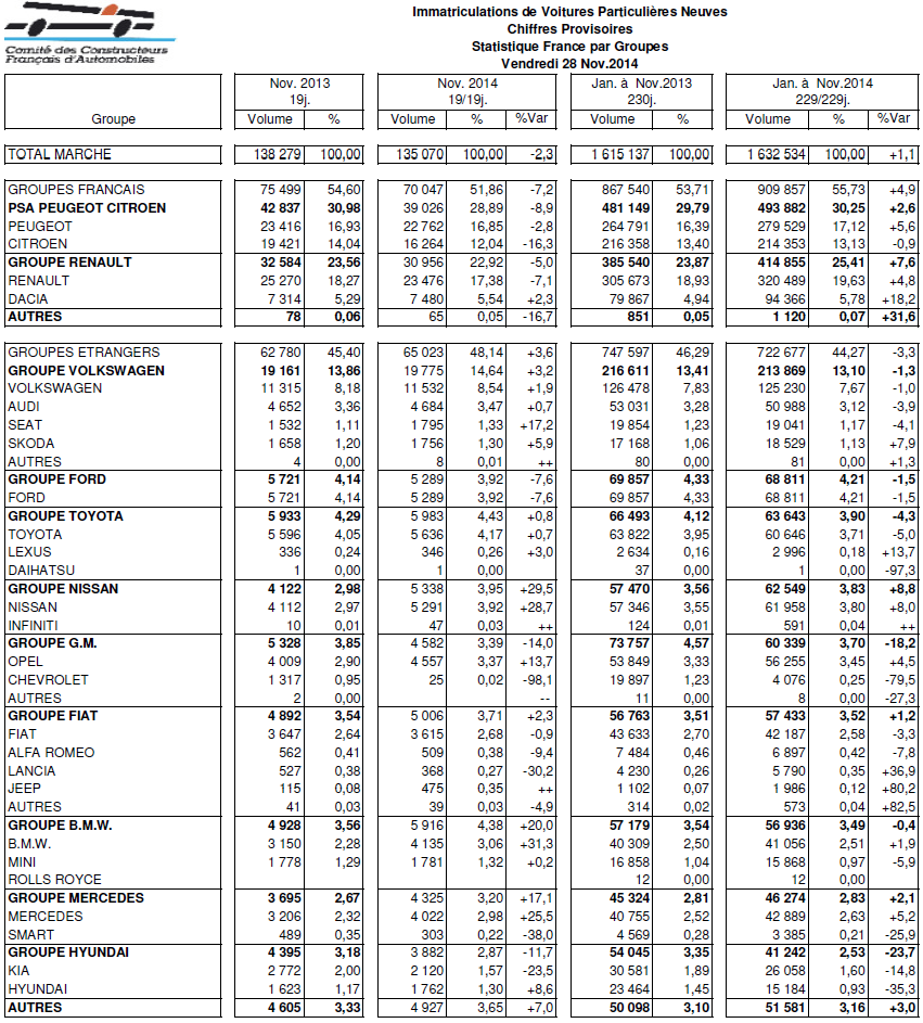 Avec 135 070 immatriculations en novembre 2014, le marché français des voitures particulières neuves a reculé de 2,3% (à nombre de jours ouvrables identique,19 jours). Depuis janvier, les immatriculations se sont établies à 1 632 534 unités, soit une hausse de 1,1% en données brutes (+1,5% à nombre de jours ouvrables comparable, 229 jours en 2014, contre 230 de janvier à novembre 2013).