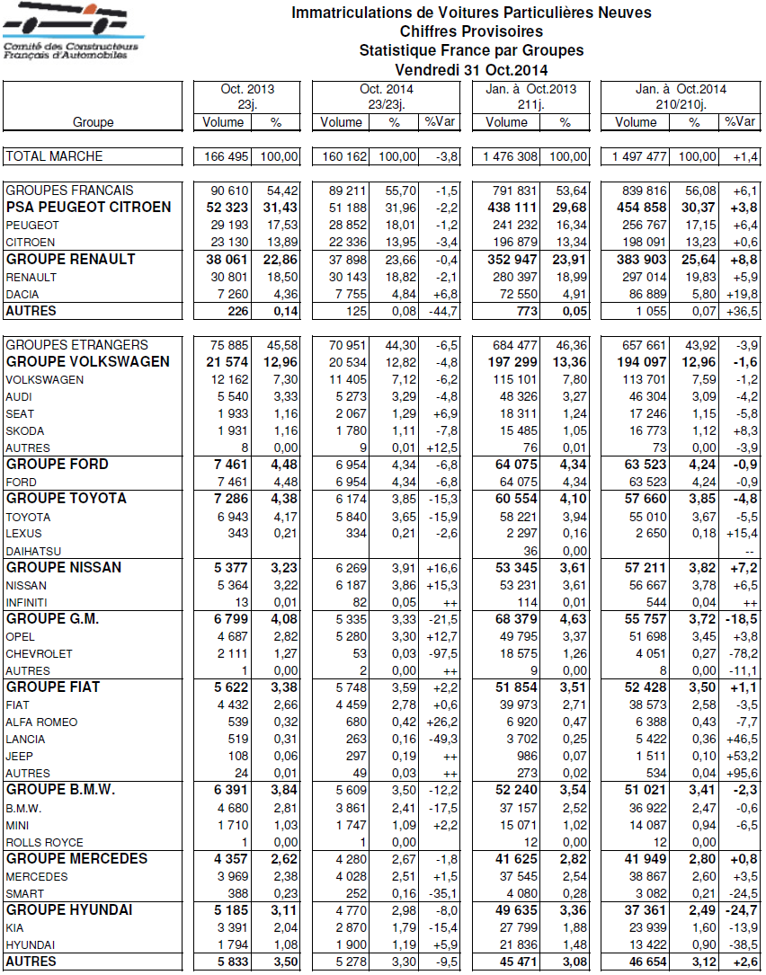 Le CCFA (Comité des Constructeurs Français Automobile) vient de publier les chiffres des immatriculations pour le mois d’octobre 2014. Avec 160 162 immatriculations, le marché français des voitures particulières neuves a diminué de 3,8% à nombre de jours ouvrables identique (23 jours) par rapport à 2013.