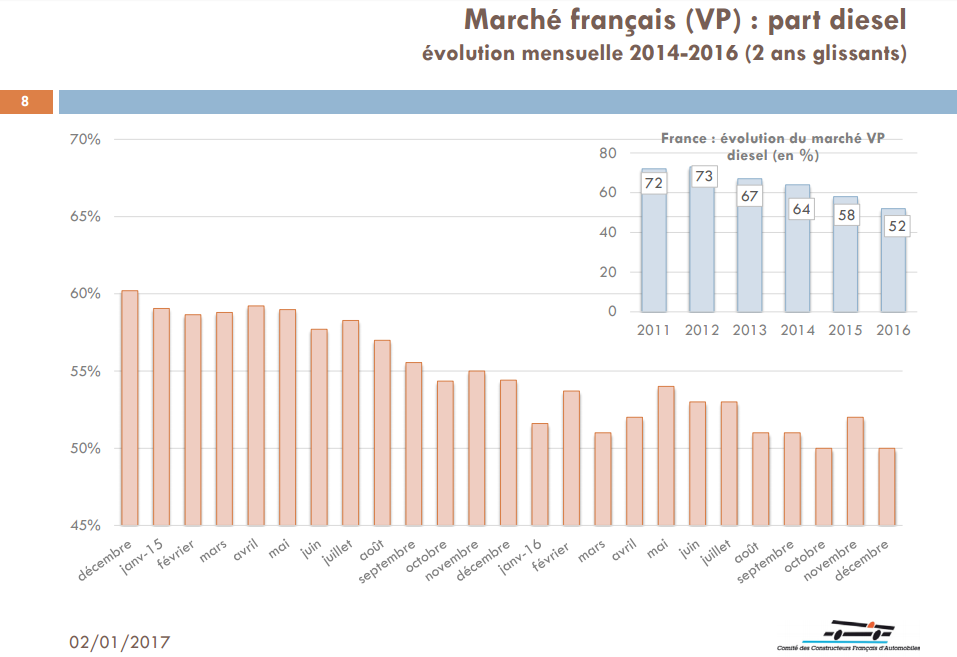 Fait marquant, le diesel continue sa chute en ce début d’année, ceci malgré le léger rebond de décembre 2016. Ainsi, la part de marché des voitures neuves diesel est de 49,87% en janvier 2017.
