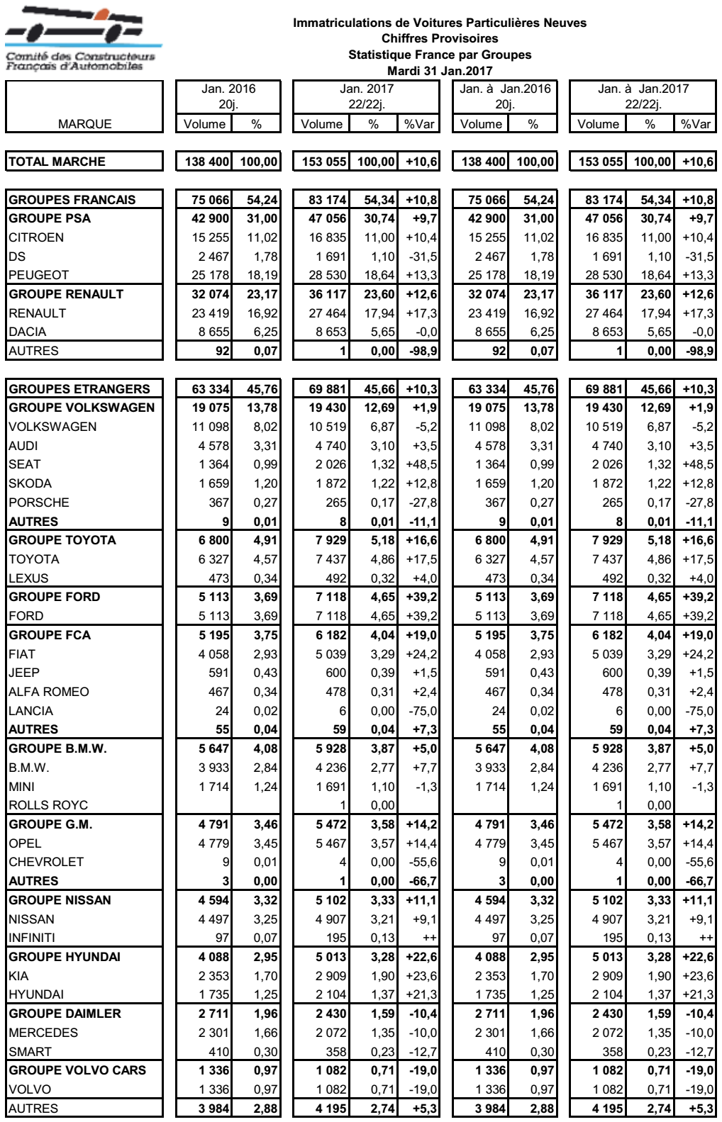 Ce chiffre prometteur est a pondéré car janvier 2017 a compté 22 jours ouvrés contre 20 l’année dernière. Ainsi, et à nombre de jours ouvrés comparable, la hausse n’est que de 0,5%. En revanche, les constructeurs français sont tous dans le positif sur l’ensemble de leurs marques (à part DS) : PSA : +9,7% et Renault : +12,6%.