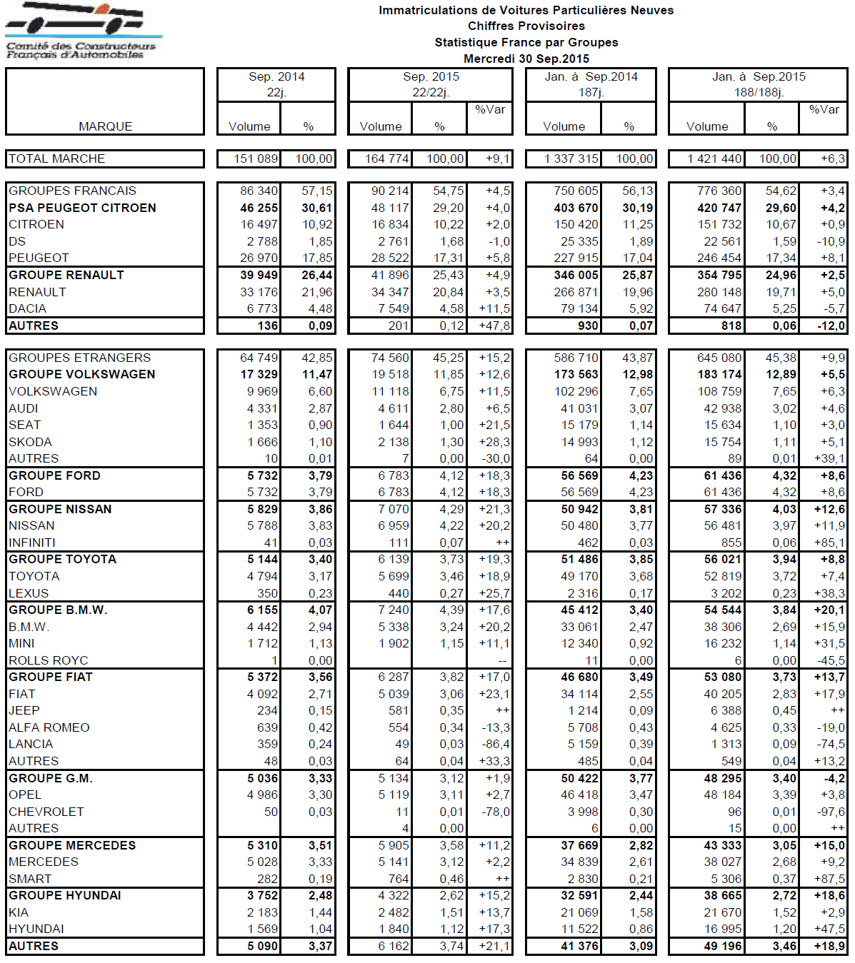 Le CCFA (Comité des Constructeurs Français d’Automobiles) vient de publier les chiffres de ventes des voitures particulières neuves de septembre 2015. Avec 164 774 immatriculations, le marché français progresse de 9,1% .