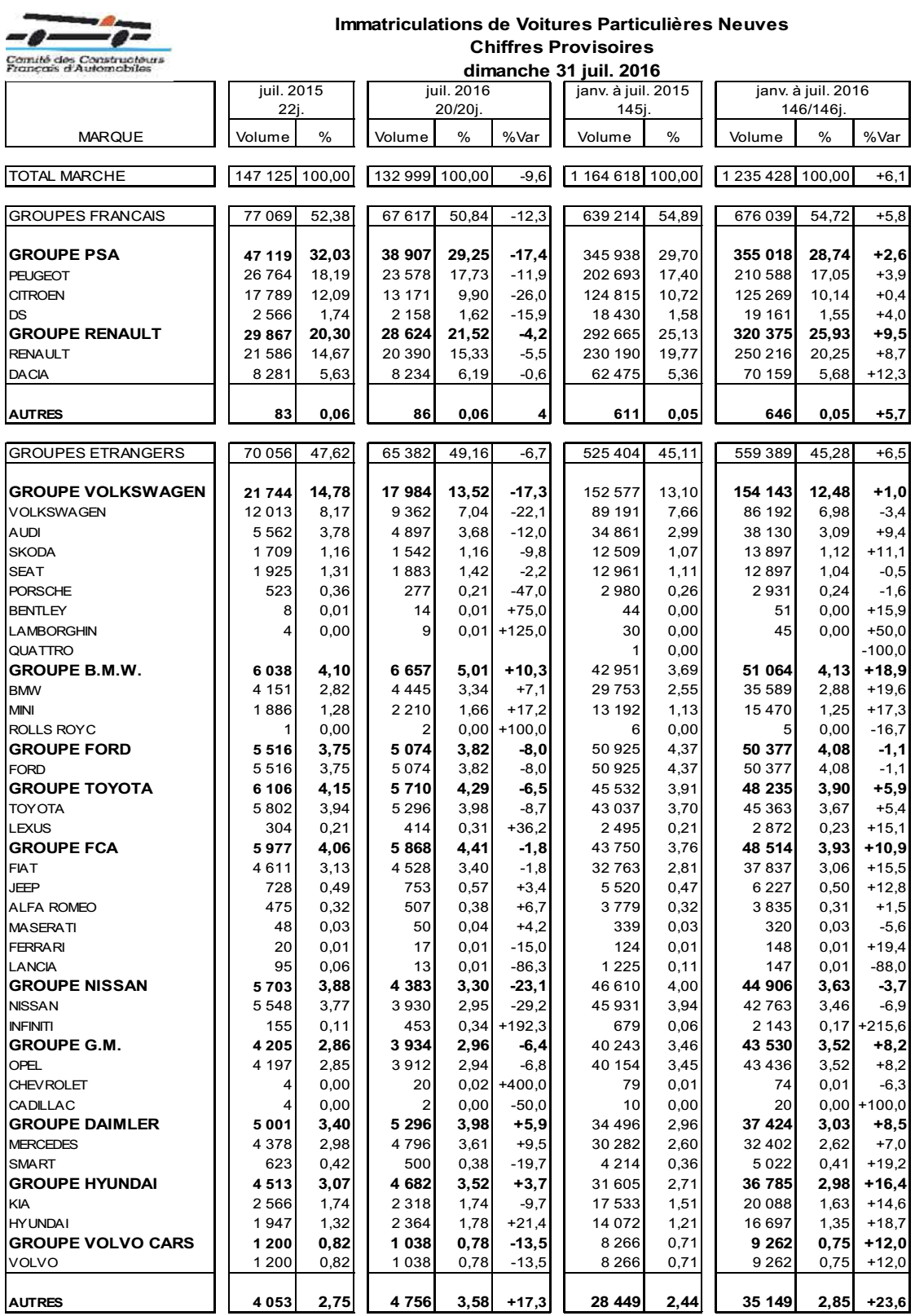 Sur les sept premiers mois de 2016, avec 1 235 428 immatriculations, le marché français des voitures particulières neuves est en hausse de 6,1 % en données brutes et de 5,4 % à nombre de jours ouvrables comparable par rapport à la même période de 2015 (146 jours sur les sept premiers mois de 2016 et 145 jours sur la même période de 2015).