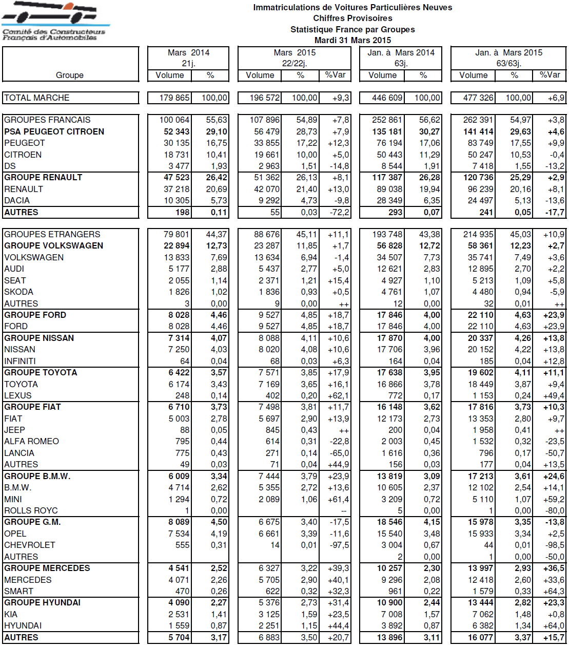 Même si elles restent comme toujours leaders à domicile, les voitures françaises ne progressent pas autant que les étrangères en termes de ventes. Parmi les meilleurs scores des groupes étrangers pour mars 2015, on retrouve BMW (+23,9%) bien aidé par le succès de la MINI (+61,4%) ! Quant à la nouvelle Smart, le succès est au rendez-vous avec +32,3% de ventes par rapport à mars 2014. Avec le très bon +40,1% de Mercedes-Benz, l’autre groupe allemand affiche une hausse globale de +39,3%. Ce qui lui permet d’être en tête des progressions devant Hyundai. En effet, le groupe coréen affiche un excellent +31,4%. Retrouvez tous les chiffres en détails ci-dessous.