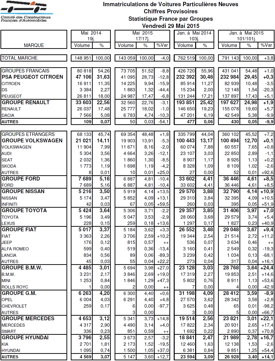 Sur les cinq premiers mois de 2015, avec 791 143 immatriculations, le marché français des voitures particulières neuves est en hausse de 3,8 % en données brutes et de 5,8 % à nombre de jours ouvrables comparable par rapport à la même période de 2014 (101 jours de janvier à mai 2015 et 103 jours de janvier à mai 2014). Retrouvez tous les chiffres en détail ci-dessous;