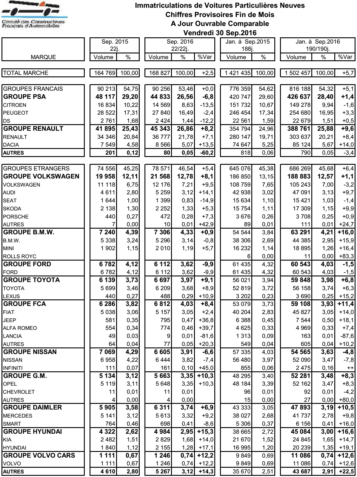 Alors que le Mondial de l’Automobile ouvre ses portes aujourd’hui, le CCFA vient de publier les chiffres des ventes de septembre 2016. Avec 168 827 immatriculations, le marché français des voitures particulières neuves est en hausse de 2,5 % (en données brutes et à nombre de jours ouvrables identique par rapport à septembre 2015 : 22 jours.