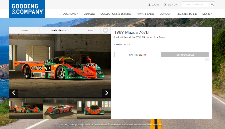 La maison Gooding & Company mettra en vente le 10 mars prochain en Floride l’une des trois Mazda 767B construite pour la saison 1989. Celle voiture de course mythique est la petite sœur de la 787B victorieuse lors des 24 Heures du Mans 1991.