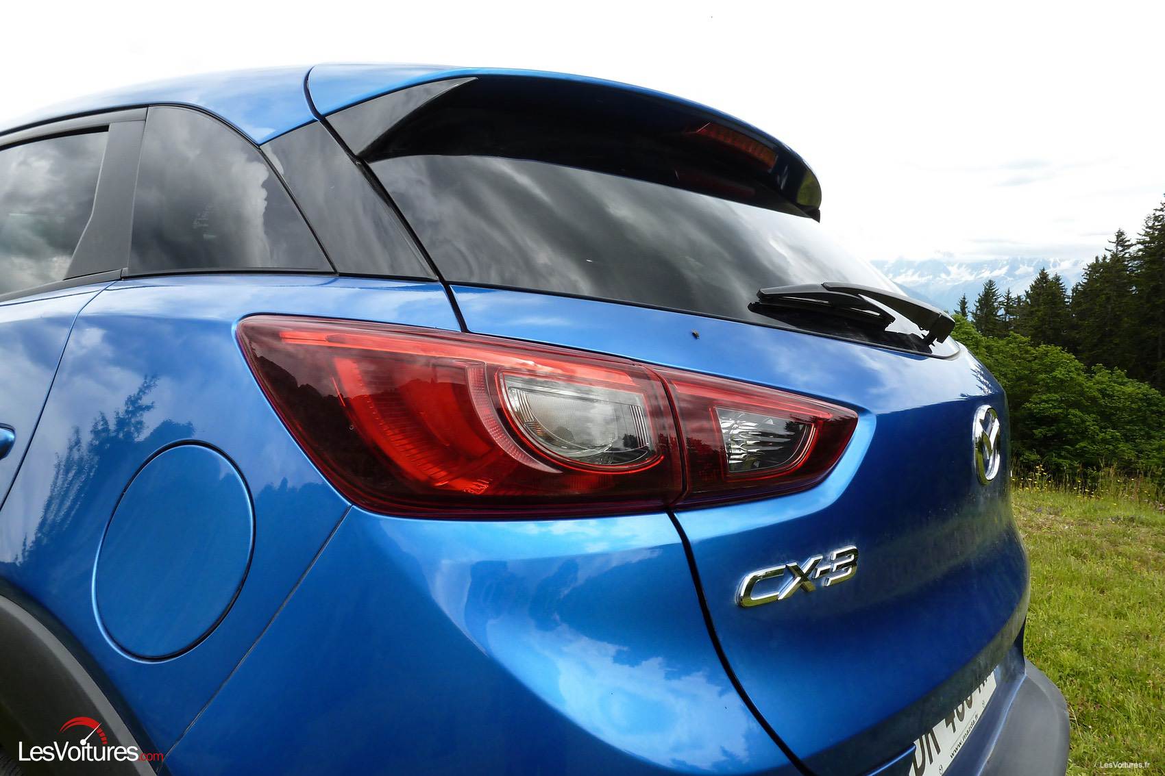 A l’arrière, c’est tout aussi solide et sérieux en termes de formes grâce à un hayon creusé, des feux aussi réussis qu’à l’avant et l’indispensable double sortie d’échappement pour le style baroudeur. Comparativement au Peugeot 2008, le CX-3 est légèrement plus long et plus bas sur pattes avec respectivement 4,275 m et 1,535 m (2008 : 4,159 m et 1, 556 m).