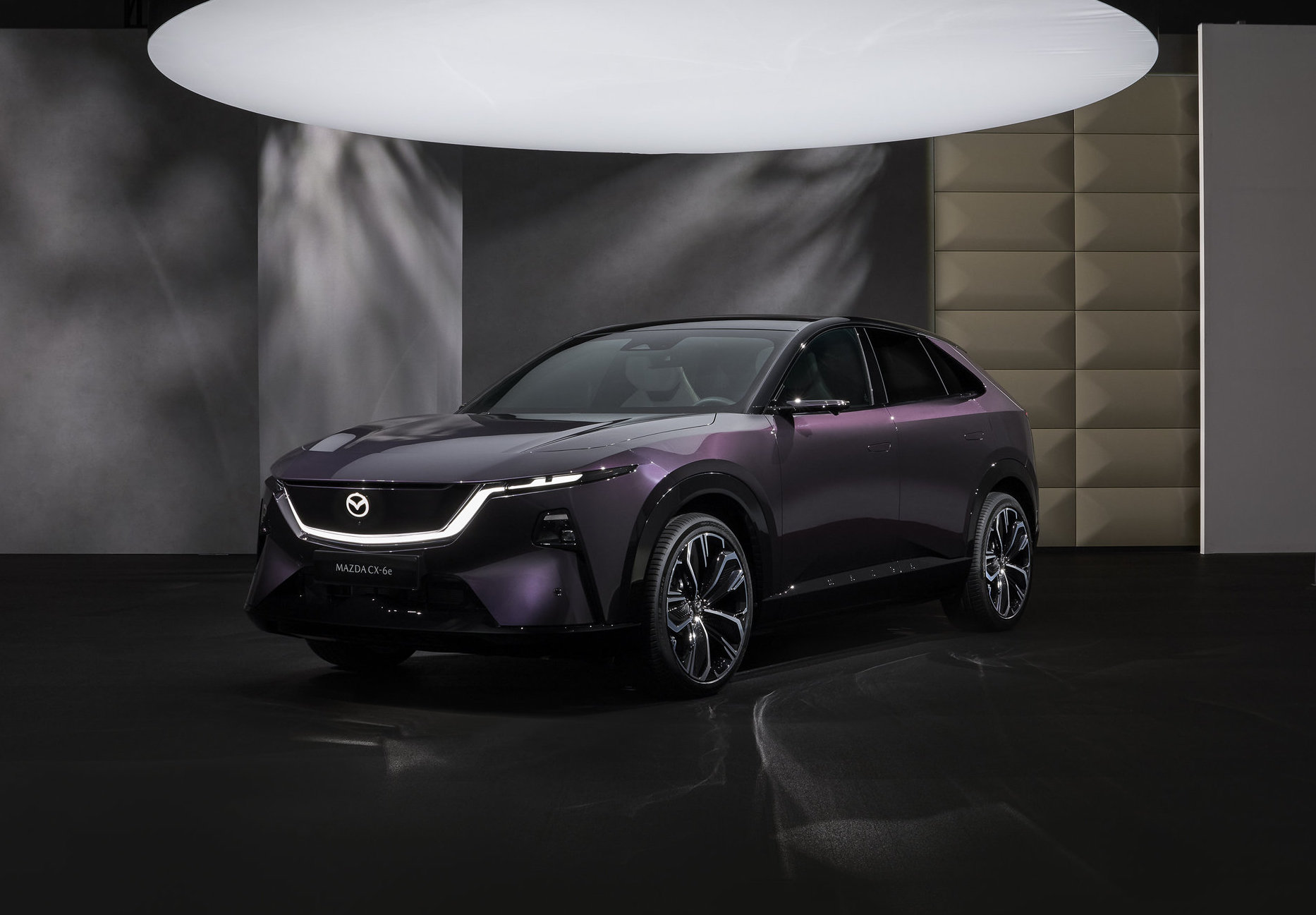 Sur le plan du style, le SUV 100 % électrique Mazda CX‑6e reprend fidèlement les lignes de l’EZ‑60 chinois, mais les designers basés à Hiroshima ont réussi à l’intégrer dans le langage « Kodo Design ». La face avant adopte un panneau plein en guise de calandre, surmonté d’un aileron qui prolonge le capot plongeant. Un jonc lumineux relie les feux de jour ultra‑fins, tandis que les projecteurs principaux, très compacts, sont intégrés dans le bouclier. L’ensemble confère au modèle une identité visuelle forte, plus sculptée que celle des précédents SUV Mazda.