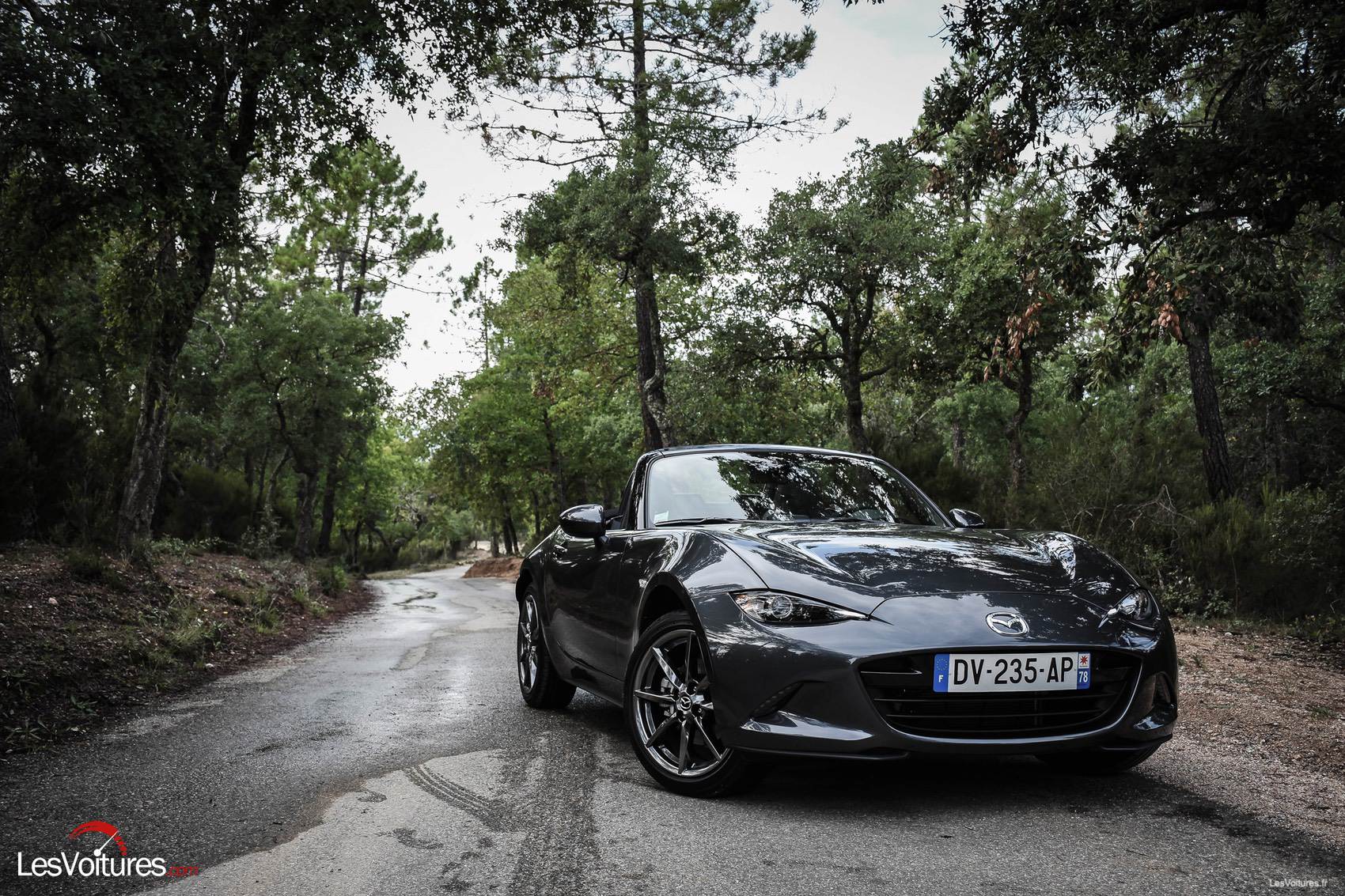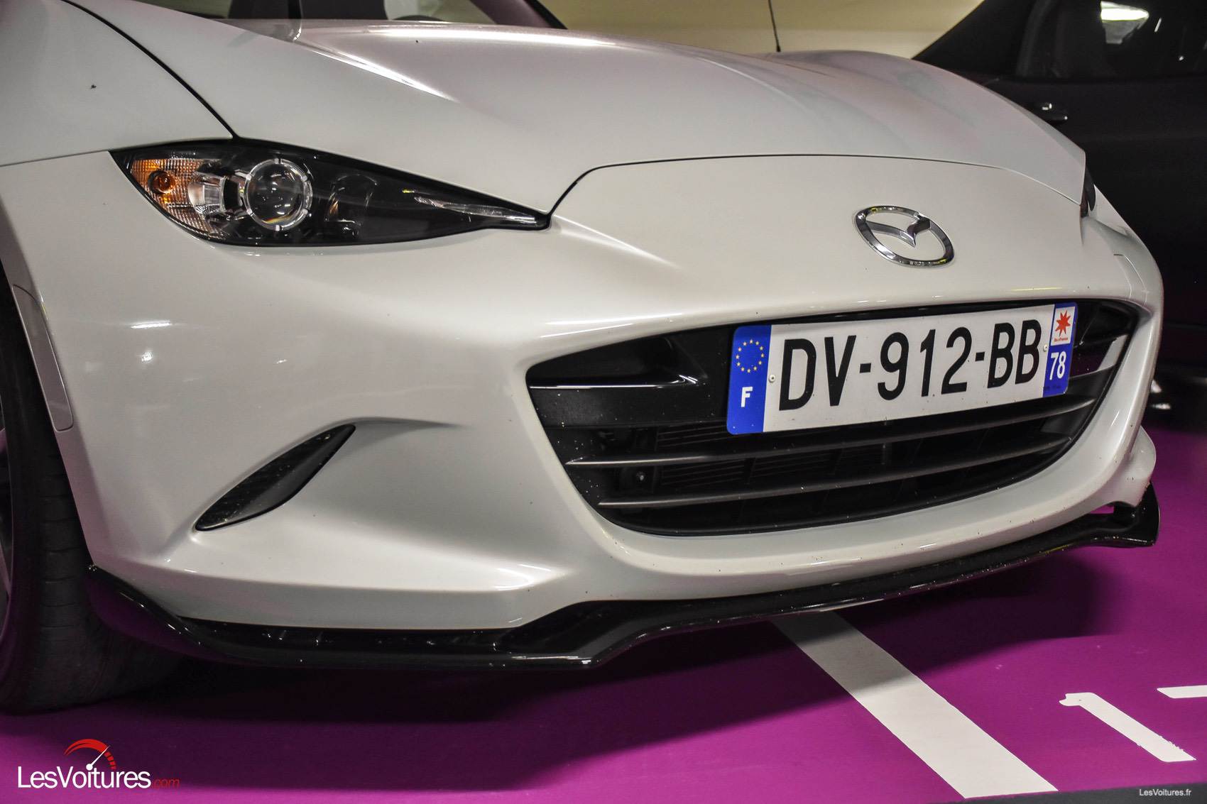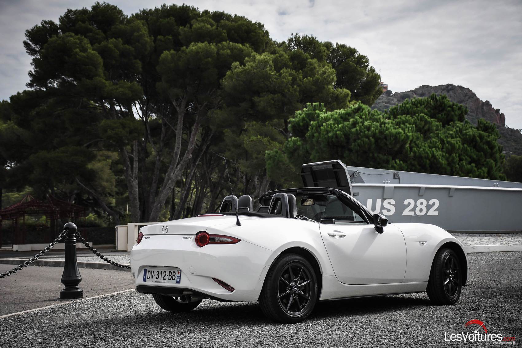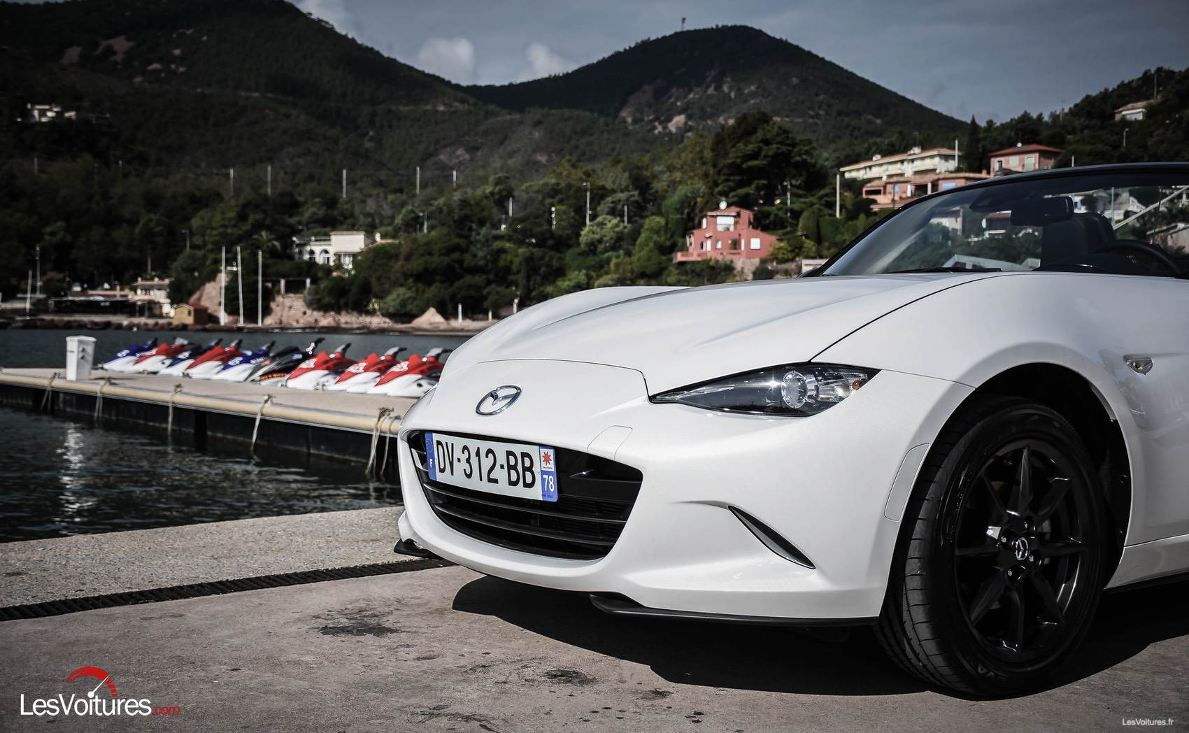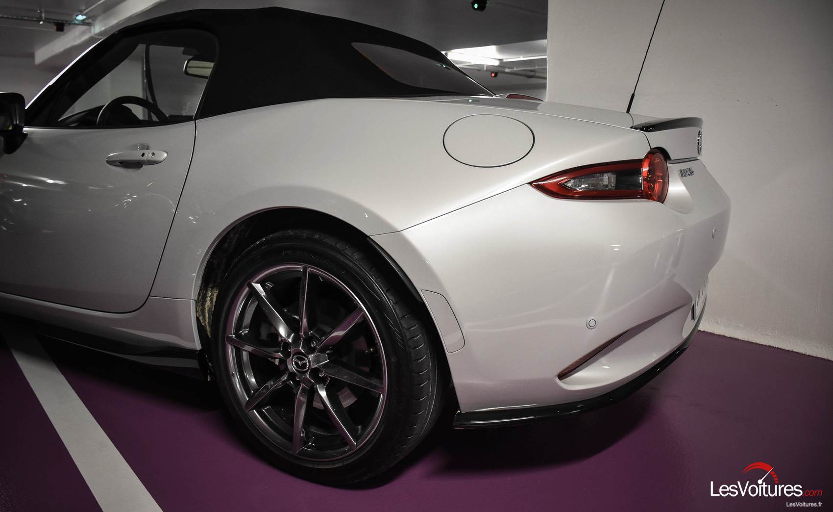 Plaisir, sensations, comportement sans failles, le MX-5 est une réussite. Notre choix, vous l’aurez compris se porte sur le 1.5L SKYACTIV-G 131 ch car en matière de rapport prix/plaisir, il n’y a pas mieux aujourd »hui sur le marché automobile. Il devrait tout naturellement représenter la majorité des ventes. A nos yeux, le MX-5 2.0L SKYACTIV-G 160 ch s’adresse à une clientèle en recherche, certes de réjouissance au volant, mais de plus d’agréments de conduite et de confort. Osons définir cette version de « mini GT cabriolet » ! Les tarifs du Mazda MX-5 débutent à 24 800 € (1.5L SKYACTIV-G 131 ch Elégance). Nos trois modèles d’essais, 1.5L SKYACTIV-G 131 ch Dynamique Artic White, 2.0L SKYACTIV-G 160 ch Sélection Grey métallisé et 1.5L SKYACTIV-G 131 ch Sélection Soul Red métalisé, s’affichent respectivement à partir de 26 900 €, 32 050 € et 29 650 €. Un pack aéro optionnel est disponible en concession à 2 000 € (à retrouver à travers les dernières photos de cet essai). Maintenant que vous savez tout sur le fabuleux MX-5, il n’y a plus qu’à trouver le temps de le conduire le plus souvent possible !