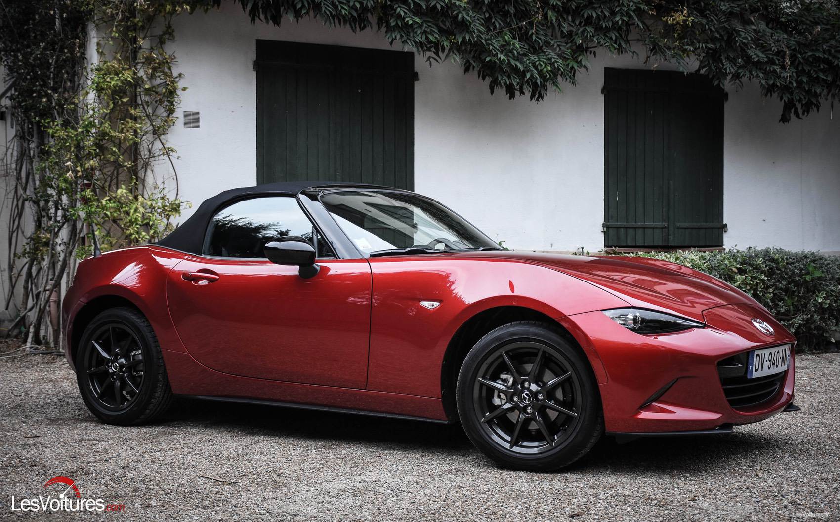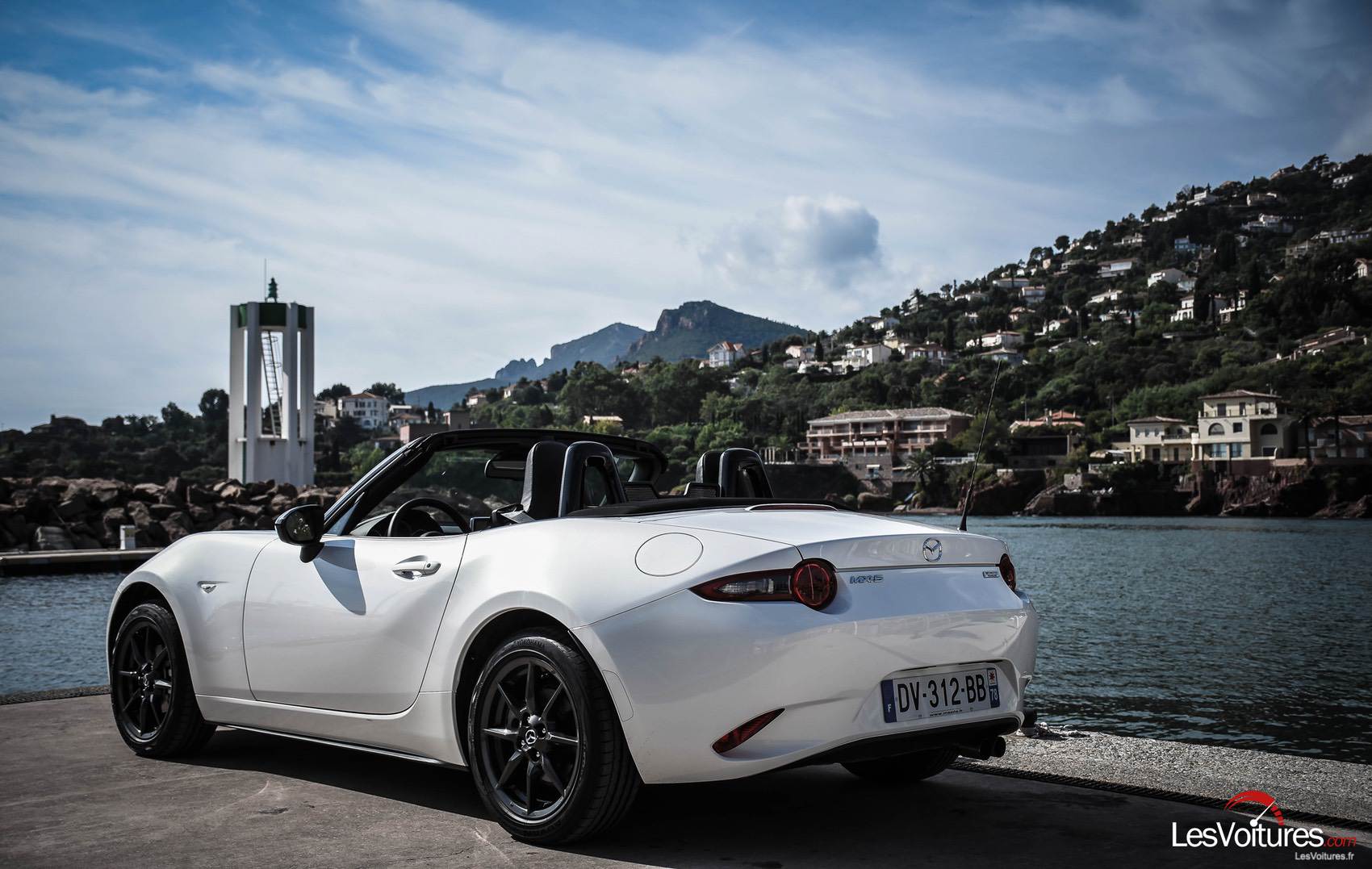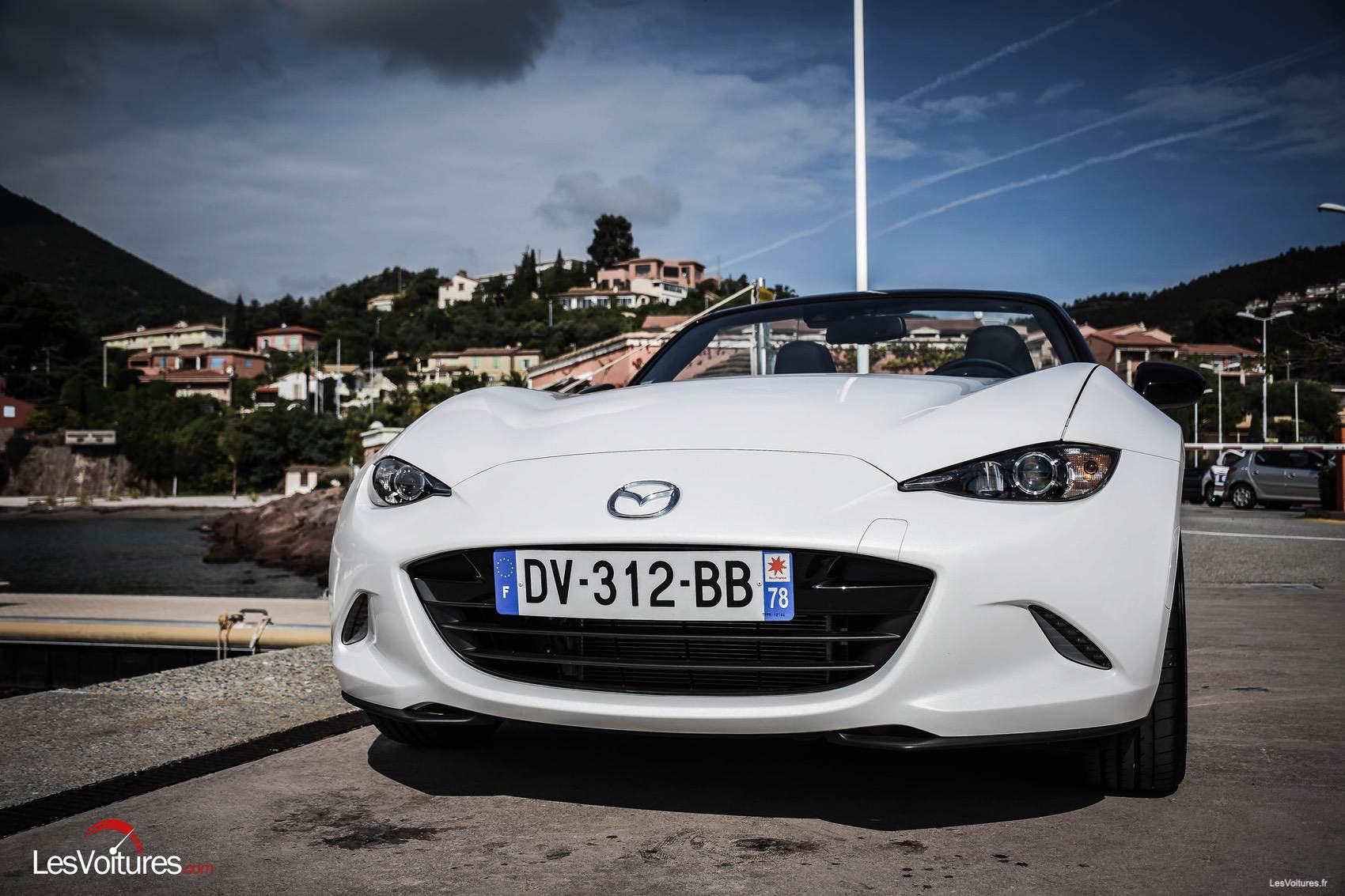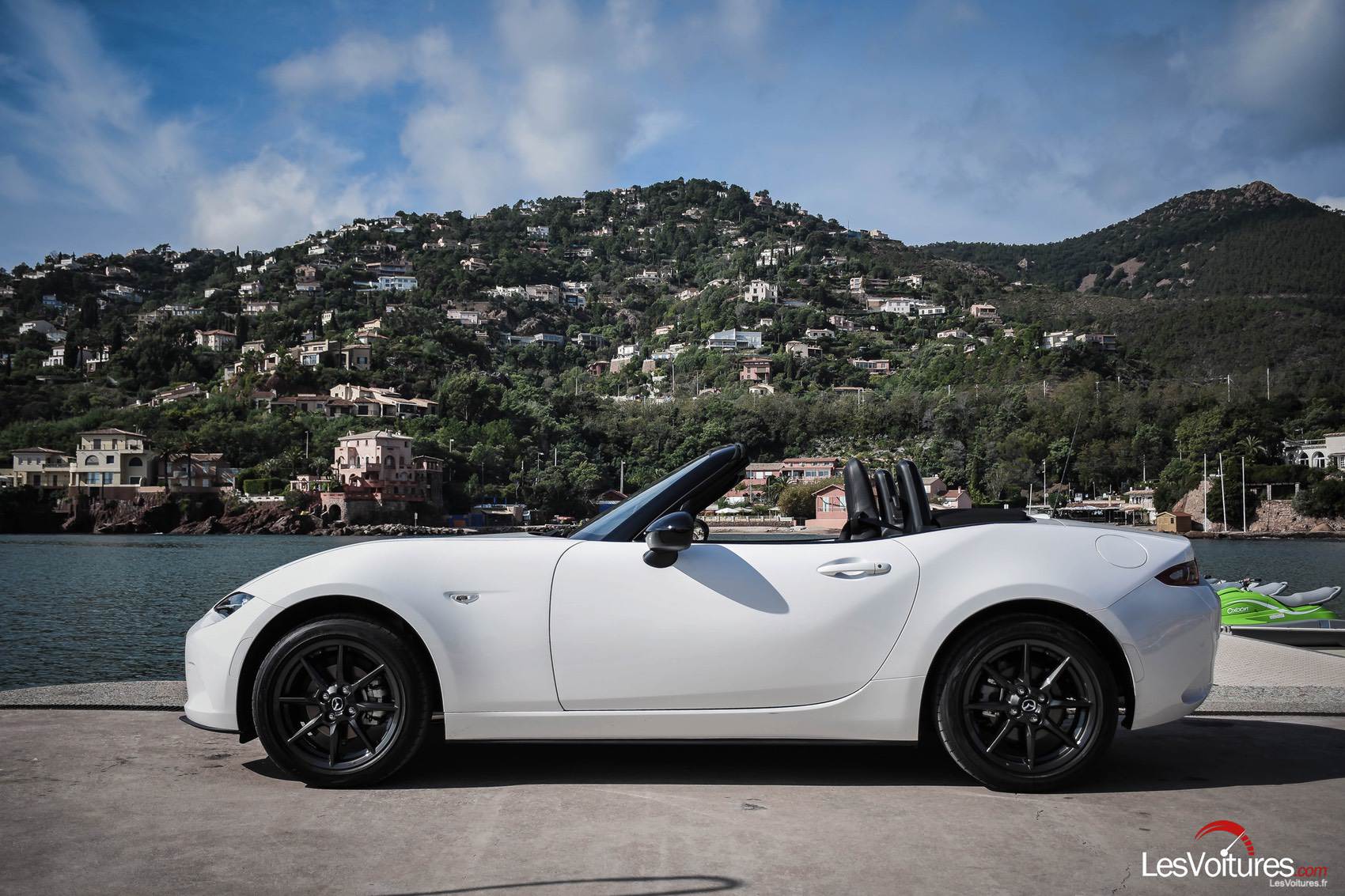 Plaisir, sensations, comportement sans failles, le MX-5 est une réussite. Notre choix, vous l’aurez compris se porte sur le 1.5L SKYACTIV-G 131 ch car en matière de rapport prix/plaisir, il n’y a pas mieux aujourd »hui sur le marché automobile. Il devrait tout naturellement représenter la majorité des ventes. A nos yeux, le MX-5 2.0L SKYACTIV-G 160 ch s’adresse à une clientèle en recherche, certes de réjouissance au volant, mais de plus d’agréments de conduite et de confort. Osons définir cette version de « mini GT cabriolet » ! Les tarifs du Mazda MX-5 débutent à 24 800 € (1.5L SKYACTIV-G 131 ch Elégance). Nos trois modèles d’essais, 1.5L SKYACTIV-G 131 ch Dynamique Artic White, 2.0L SKYACTIV-G 160 ch Sélection Grey métallisé et 1.5L SKYACTIV-G 131 ch Sélection Soul Red métalisé, s’affichent respectivement à partir de 26 900 €, 32 050 € et 29 650 €. Un pack aéro optionnel est disponible en concession à 2 000 € (à retrouver à travers les dernières photos de cet essai). Maintenant que vous savez tout sur le fabuleux MX-5, il n’y a plus qu’à trouver le temps de le conduire le plus souvent possible !