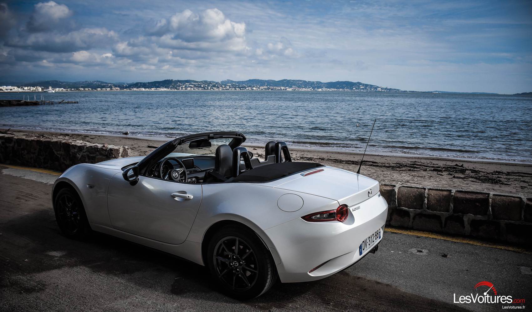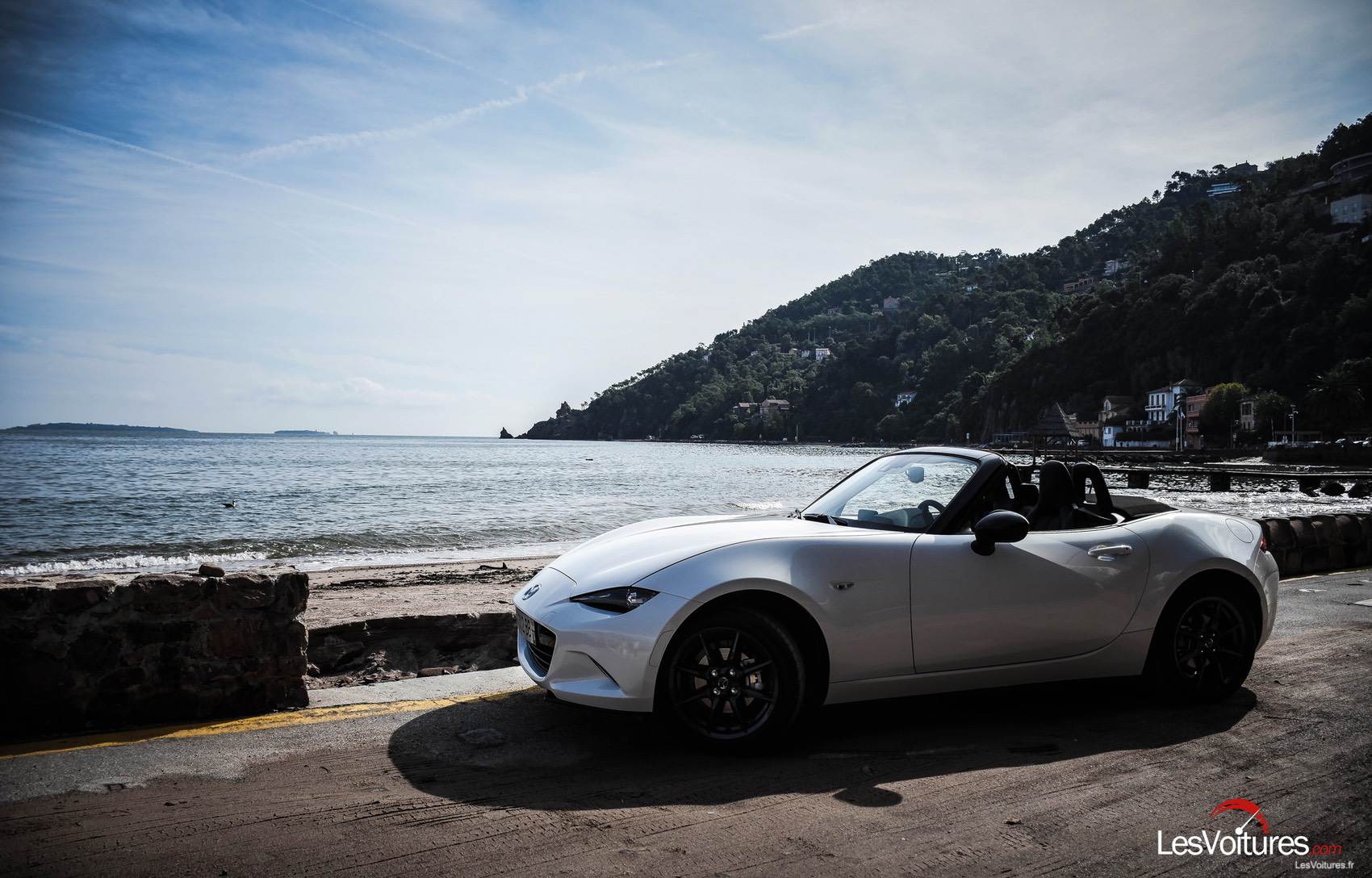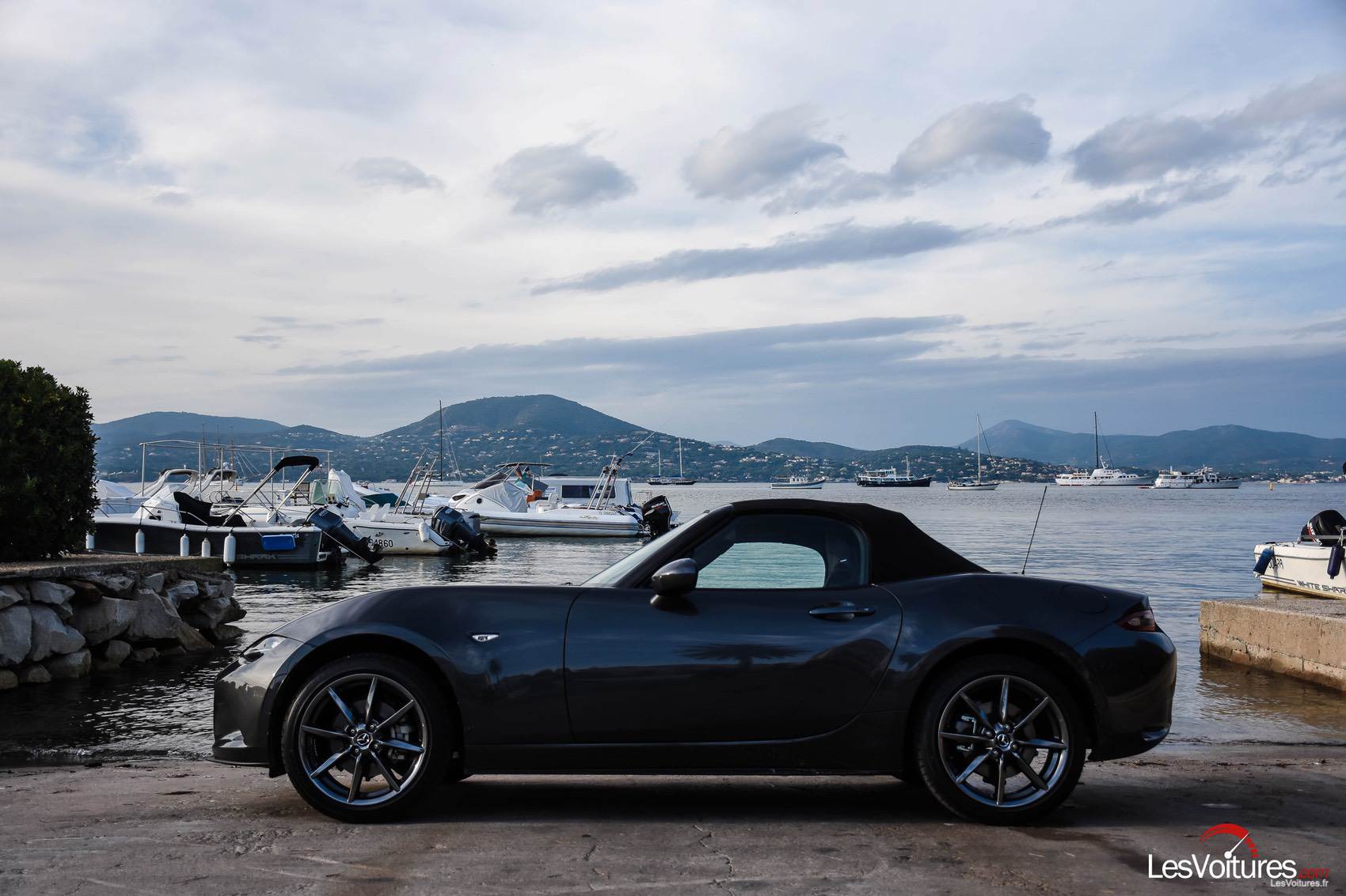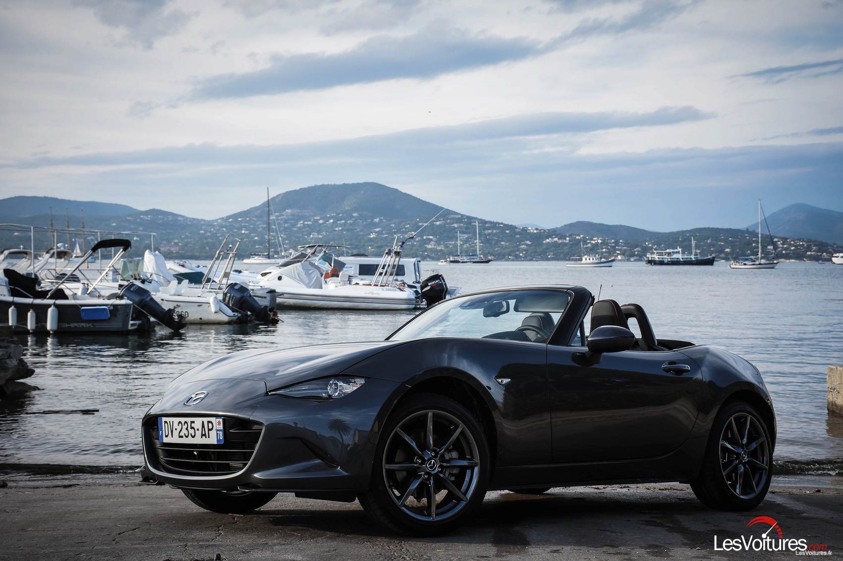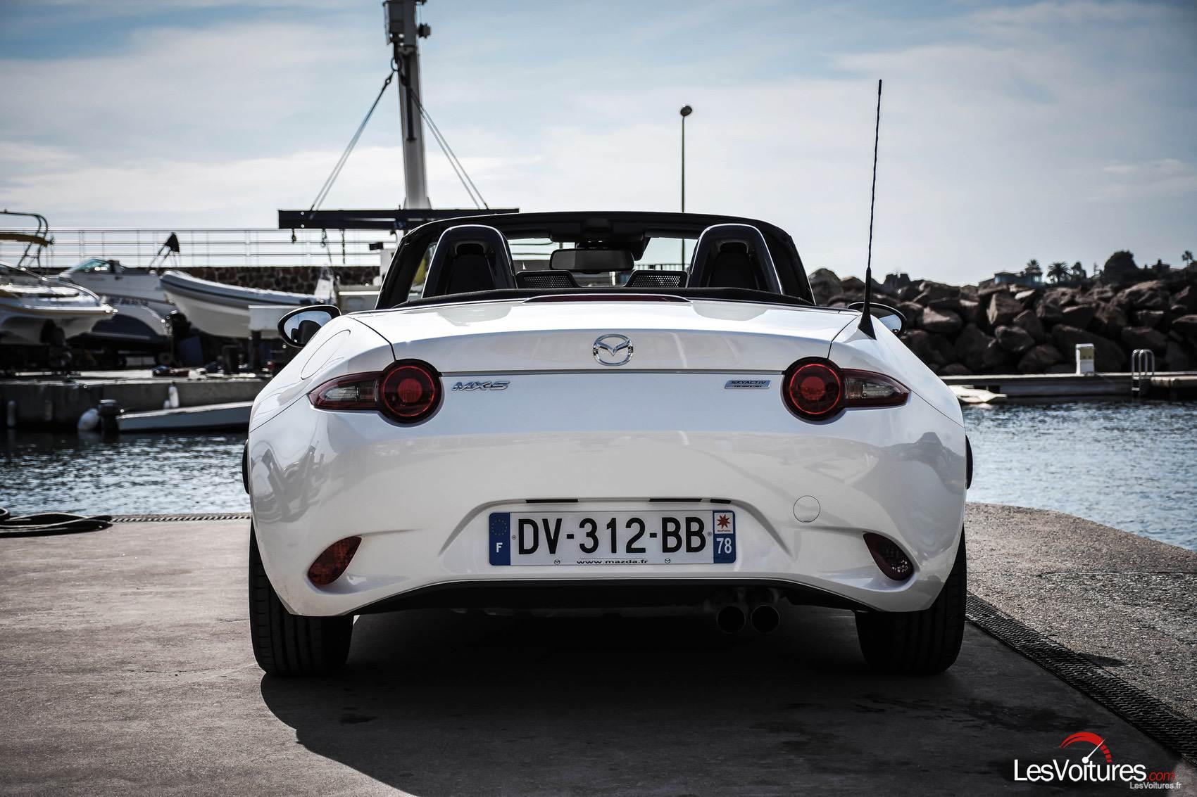 Plaisir, sensations, comportement sans failles, le MX-5 est une réussite. Notre choix, vous l’aurez compris se porte sur le 1.5L SKYACTIV-G 131 ch car en matière de rapport prix/plaisir, il n’y a pas mieux aujourd »hui sur le marché automobile. Il devrait tout naturellement représenter la majorité des ventes. A nos yeux, le MX-5 2.0L SKYACTIV-G 160 ch s’adresse à une clientèle en recherche, certes de réjouissance au volant, mais de plus d’agréments de conduite et de confort. Osons définir cette version de « mini GT cabriolet » ! Les tarifs du Mazda MX-5 débutent à 24 800 € (1.5L SKYACTIV-G 131 ch Elégance). Nos trois modèles d’essais, 1.5L SKYACTIV-G 131 ch Dynamique Artic White, 2.0L SKYACTIV-G 160 ch Sélection Grey métallisé et 1.5L SKYACTIV-G 131 ch Sélection Soul Red métalisé, s’affichent respectivement à partir de 26 900 €, 32 050 € et 29 650 €. Un pack aéro optionnel est disponible en concession à 2 000 € (à retrouver à travers les dernières photos de cet essai). Maintenant que vous savez tout sur le fabuleux MX-5, il n’y a plus qu’à trouver le temps de le conduire le plus souvent possible !