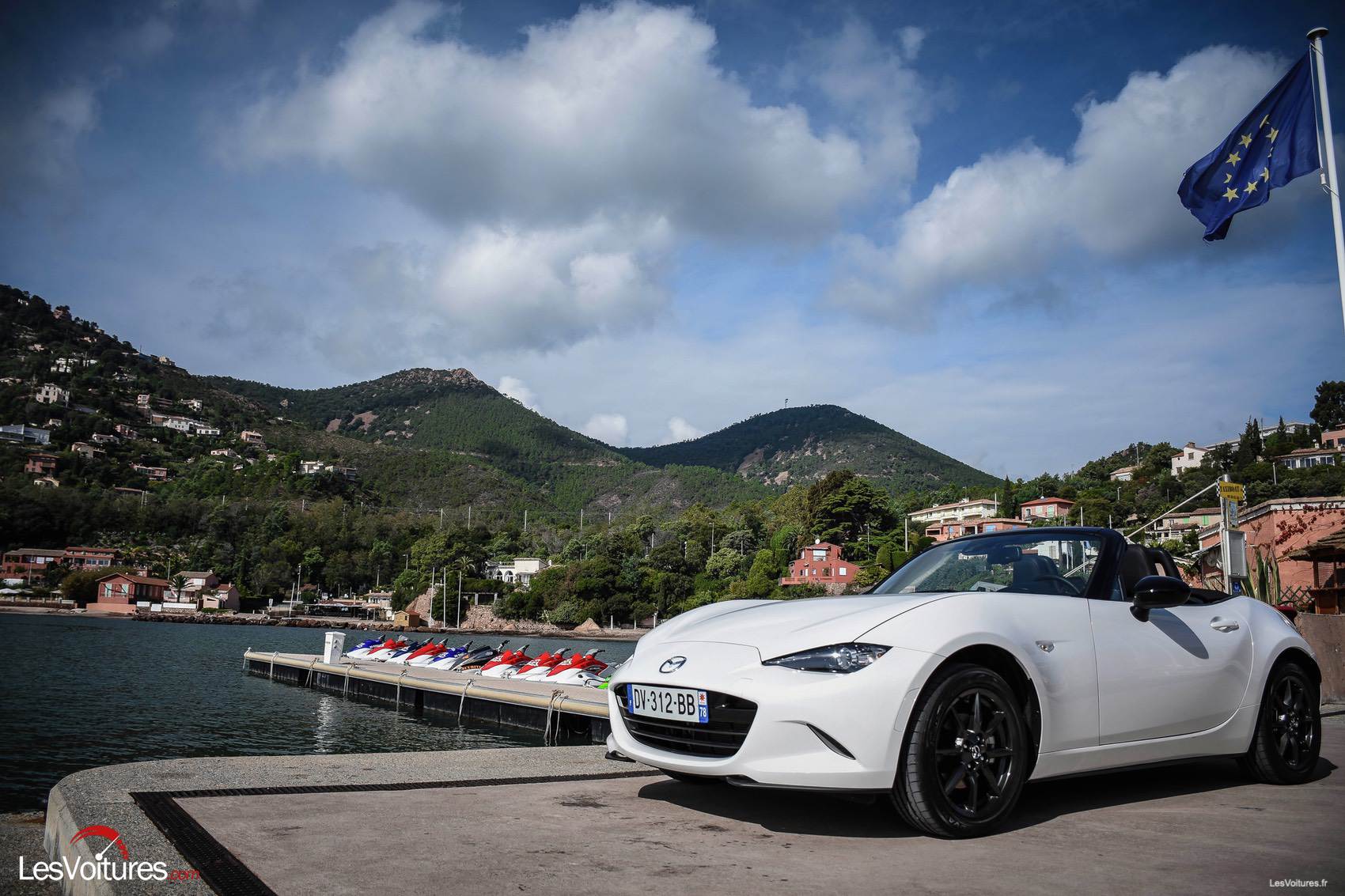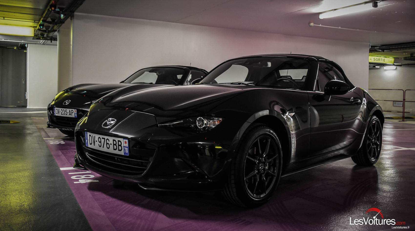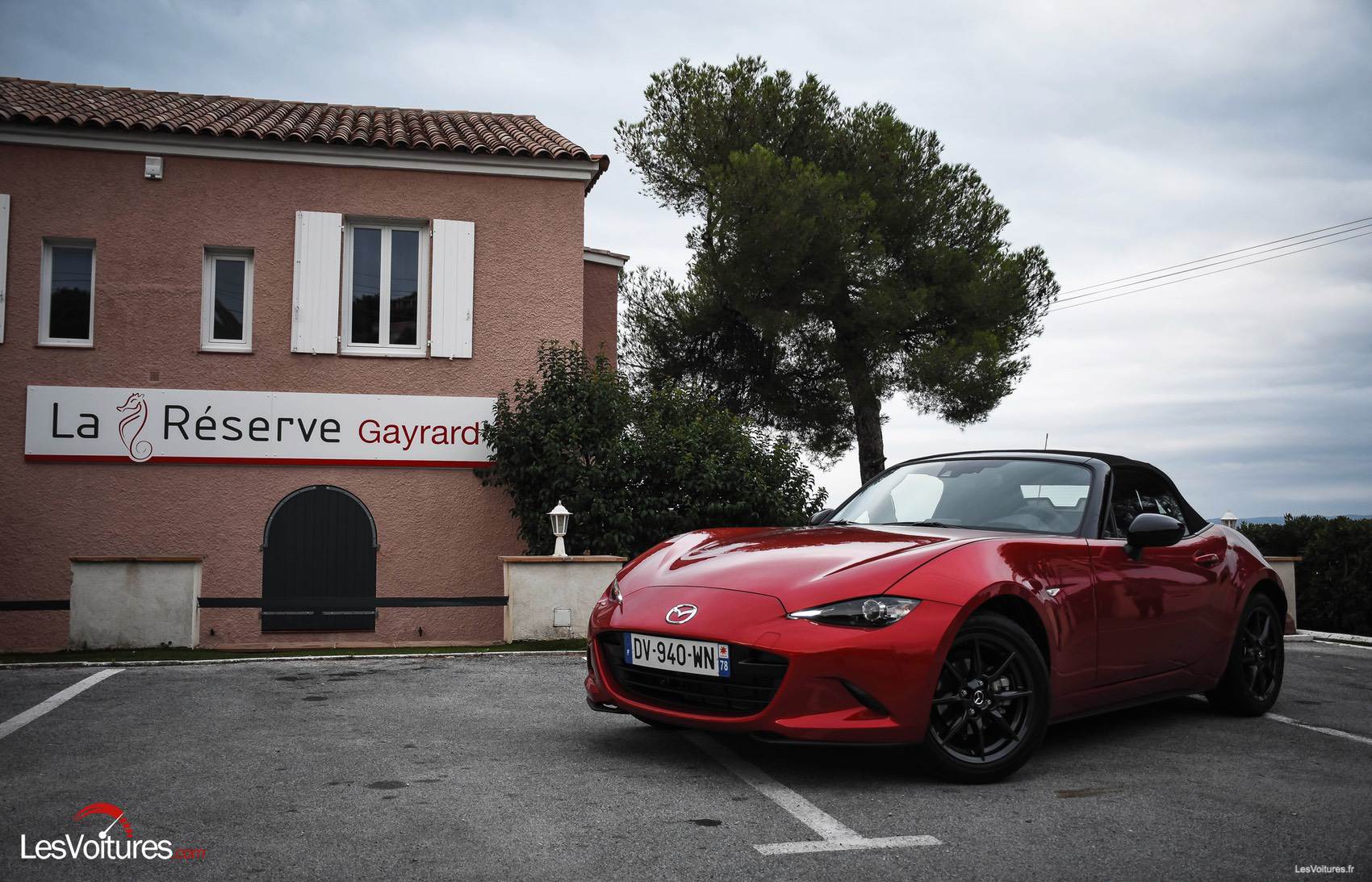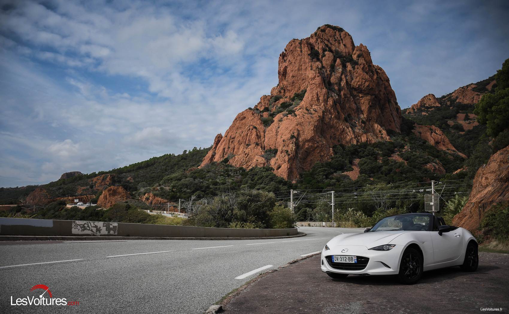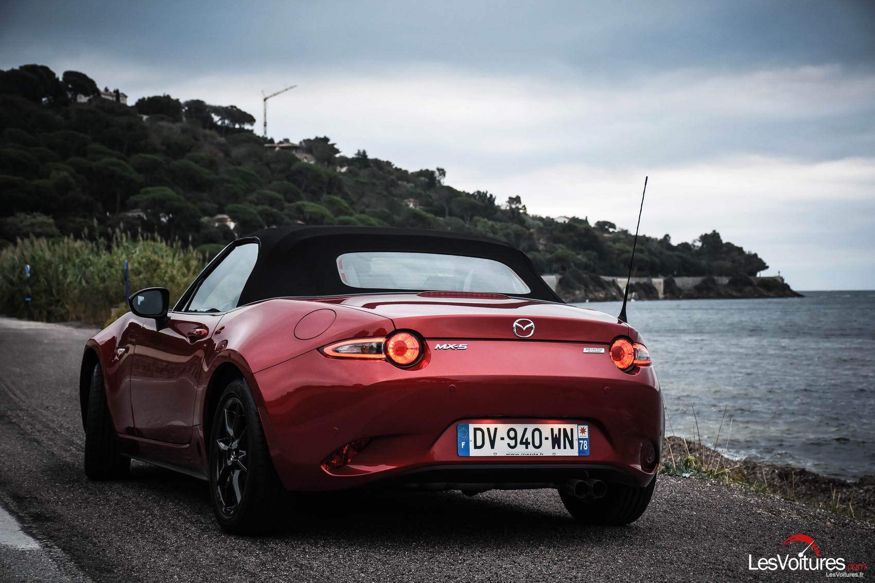 Plaisir, sensations, comportement sans failles, le MX-5 est une réussite. Notre choix, vous l’aurez compris se porte sur le 1.5L SKYACTIV-G 131 ch car en matière de rapport prix/plaisir, il n’y a pas mieux aujourd »hui sur le marché automobile. Il devrait tout naturellement représenter la majorité des ventes. A nos yeux, le MX-5 2.0L SKYACTIV-G 160 ch s’adresse à une clientèle en recherche, certes de réjouissance au volant, mais de plus d’agréments de conduite et de confort. Osons définir cette version de « mini GT cabriolet » ! Les tarifs du Mazda MX-5 débutent à 24 800 € (1.5L SKYACTIV-G 131 ch Elégance). Nos trois modèles d’essais, 1.5L SKYACTIV-G 131 ch Dynamique Artic White, 2.0L SKYACTIV-G 160 ch Sélection Grey métallisé et 1.5L SKYACTIV-G 131 ch Sélection Soul Red métalisé, s’affichent respectivement à partir de 26 900 €, 32 050 € et 29 650 €. Un pack aéro optionnel est disponible en concession à 2 000 € (à retrouver à travers les dernières photos de cet essai). Maintenant que vous savez tout sur le fabuleux MX-5, il n’y a plus qu’à trouver le temps de le conduire le plus souvent possible !