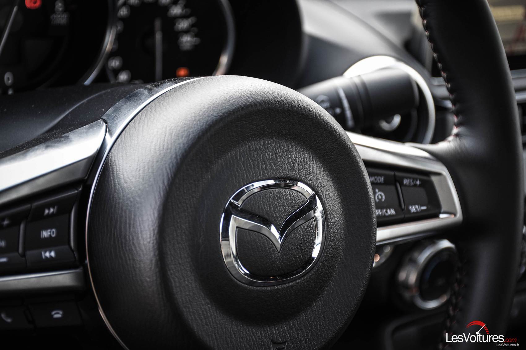 Cette dotation hyper généreuse inclut, entre autres, la climatisation manuelle, le régulateur et le limiteur de vitesse, le bluetooth et le système multimédia MZD Connect (six haut-parleurs, écran couleur 7″. Nous avons apprécié la dose de cuir intelligemment située sur le volant, le pommeau de commande de la boîte de vitesses et le levier de frein à main.