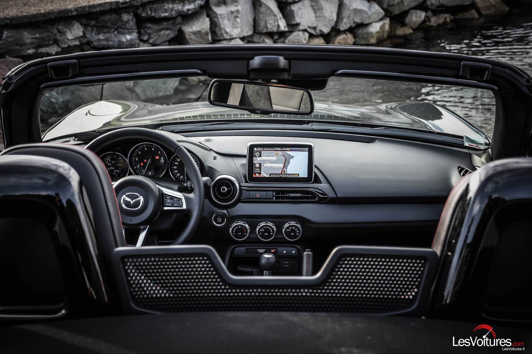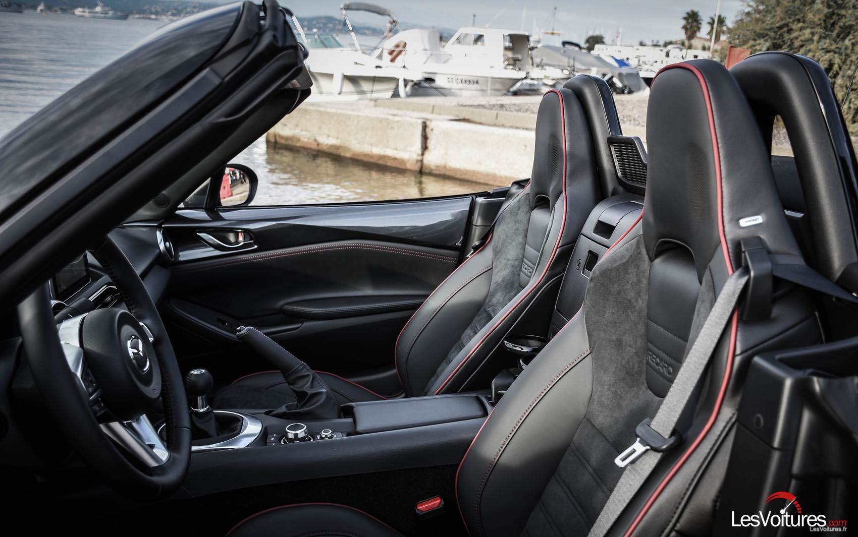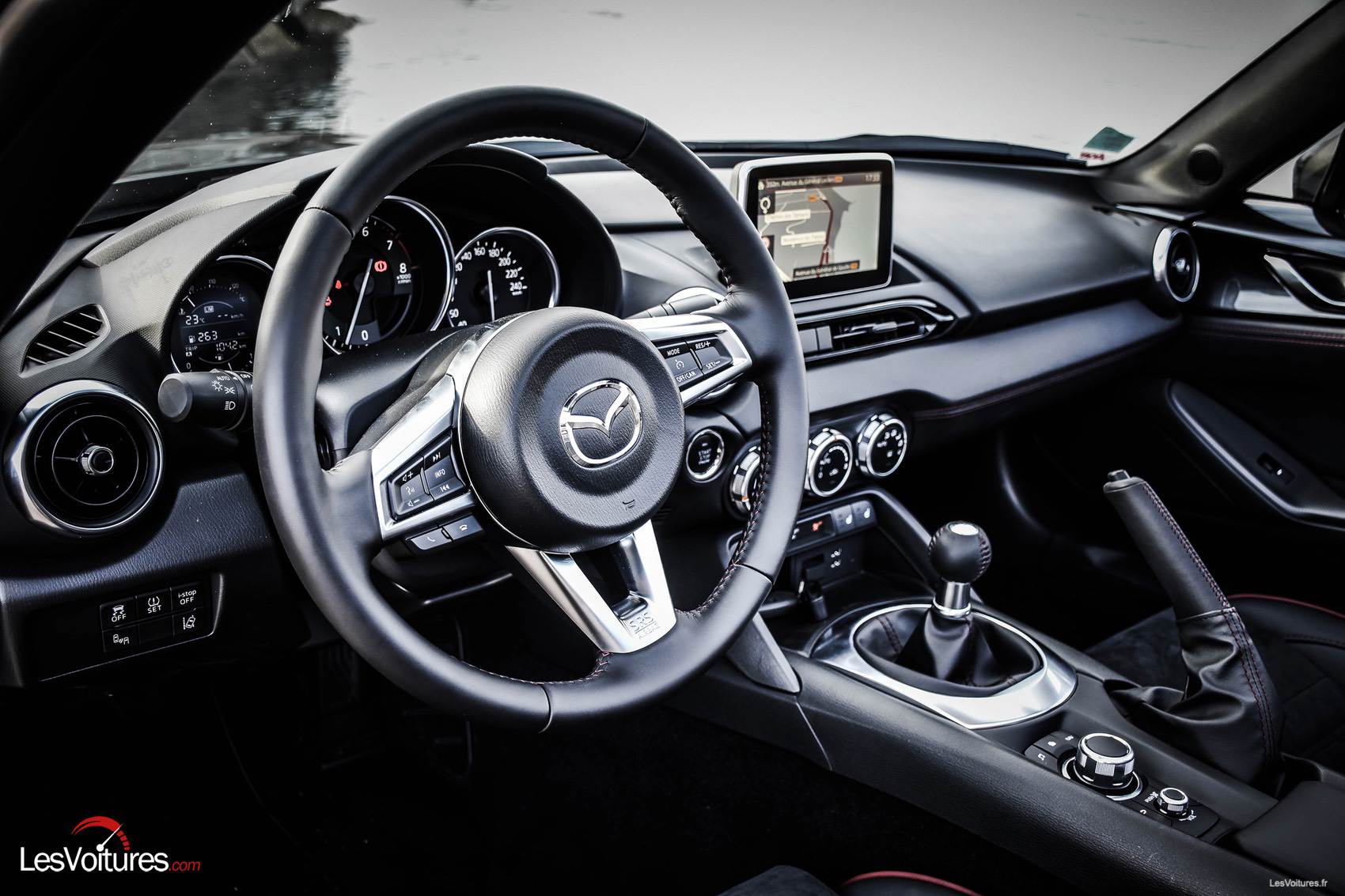 Une fois au volant du « roadster star », il suffit de quelques secondes pour retirer la capote. Cette manipulation ravira les fans de la MX-5, c’est simple et efficace. L’habitacle de l’auto a été particulièrement soigné et même si les ingénieurs de chez Mazda ont dû faire des efforts pour alléger le poids du roadster, rien ne manque. L’ambiance intérieure est sobre et sérieuse et la position de conduite est parfaite. Comme pour tous ses modèles, Mazda propose un maximum d’équipements dès le premier niveau de finition Elégance.