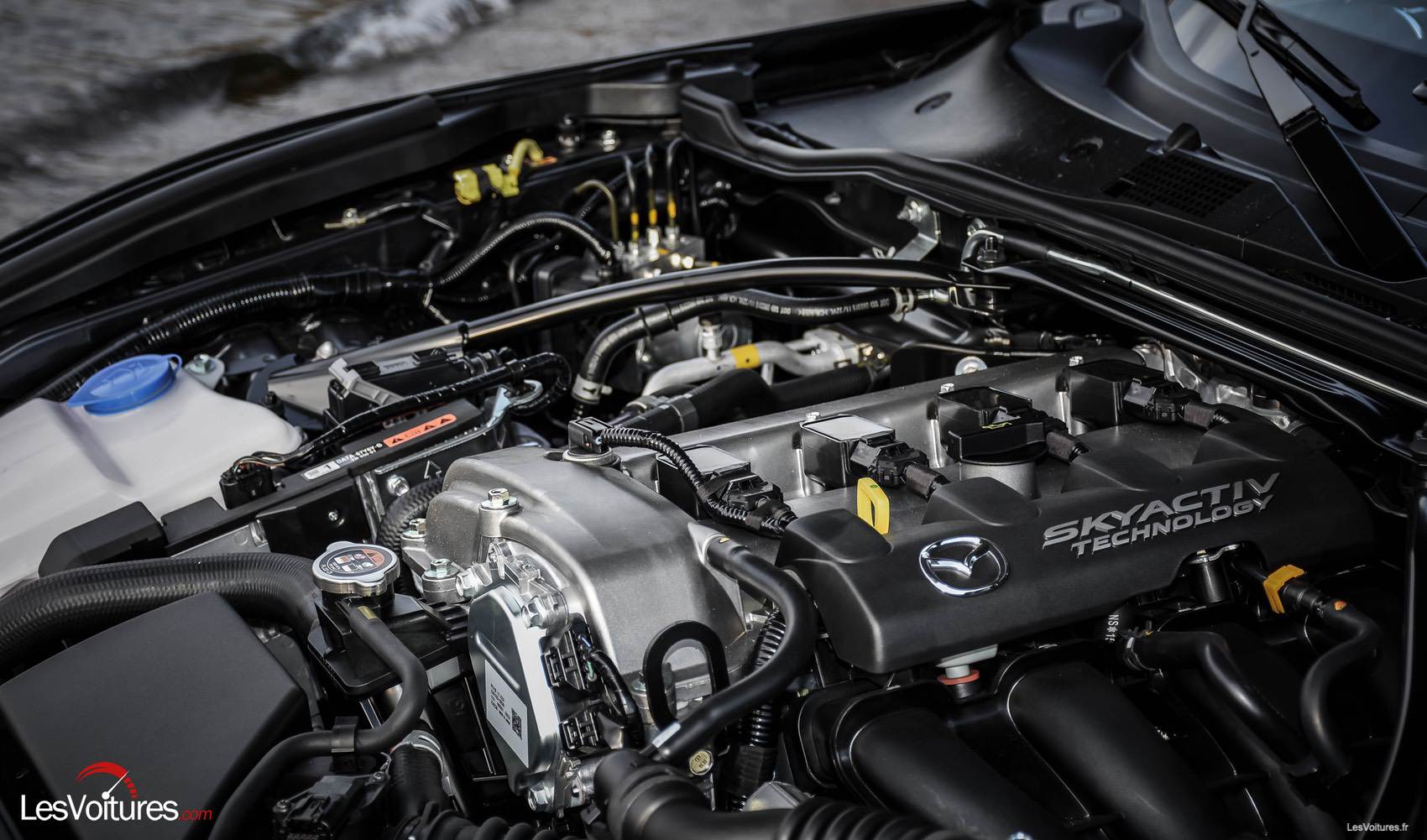 La boite de vitesses est toujours aussi efficace que le modèle 1.5 l. En revanche, la sonorité du 2.0 l est beaucoup moins présente et rageuse que le 1.5 l. Résultat : le confort est optimal au volant de ce MX-5 légèrement aseptisé. Son poids grimpe un peu, à 1 015 kilos et les performances sont au rendez-vous : 7,3 secondes de 0 à 100 km/h, 214 km/h de « V max ». Le point noir est à mettre à l’actif des émissions de CO2 : 154 g/km soit 1 600 € de malus. Enfin les consommations du MX-5 2.0L SKYACTIV-G 160 ch restent contenues : 8,7 l/100 km (cycle urbain), 6,6 l/100 km (cycle mixte) et 5,4 l/100 km (sur autoroute).