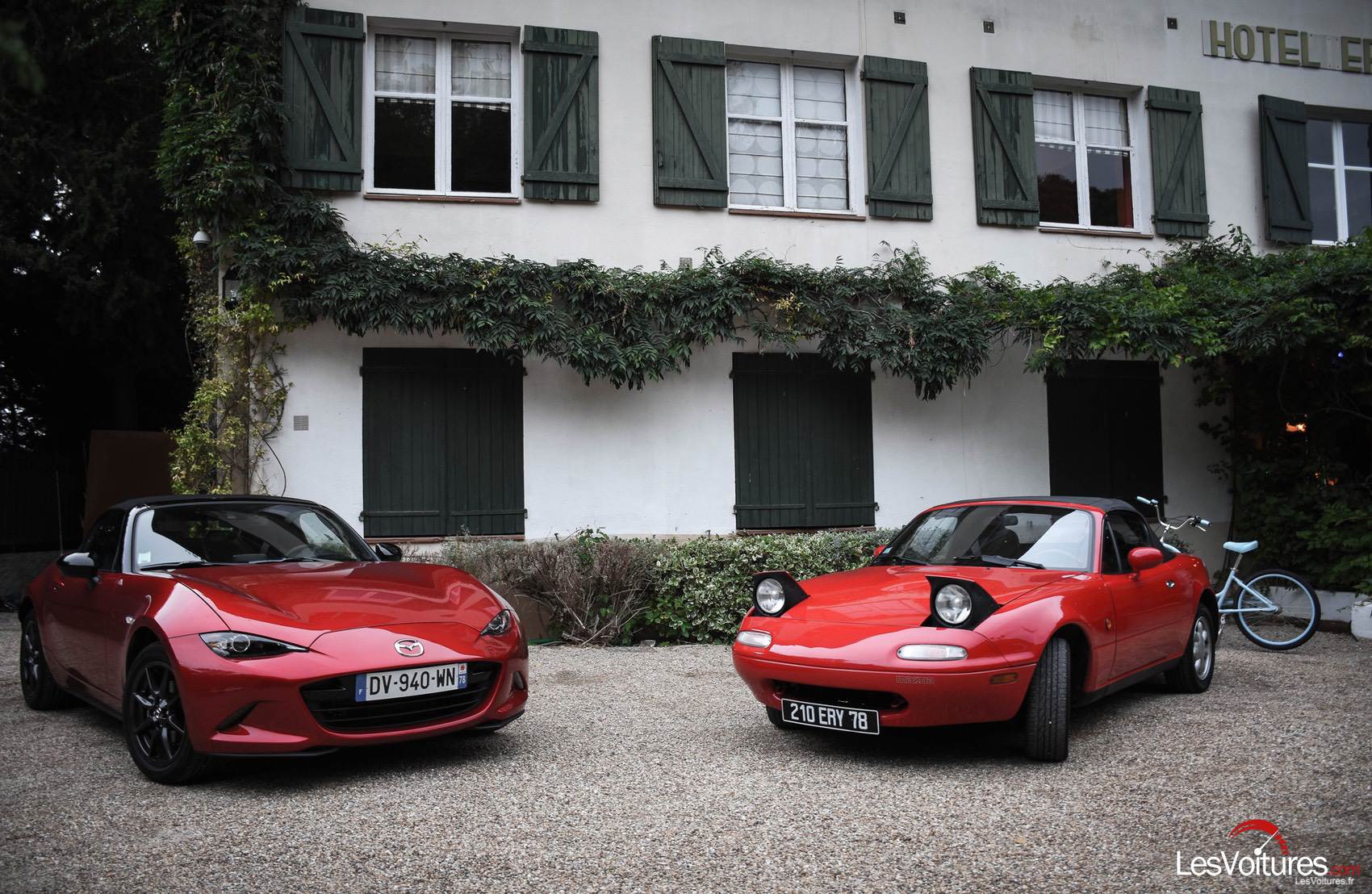 Visuellement, la MX-5 2015 fait dans la continuité en matière de silhouette pour le bonheur de ses fans et se modernise grâce au style agressif et dynamique que représente le KODO qui, rappelons-le, est basé sur l’esprit d’un animal en mouvement. Avec 3,91 m de longueur, le MX-5 2015 rend 10 cm à la précédente version (NC) et devient le modèle le plus court de son histoire. La toute première version (NA), en photo ci-dessous aux côtés du nouveau MX5, n’affichait que 3,98 m de long.