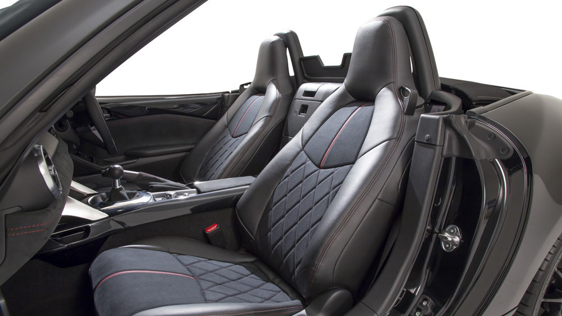 Quant à l’intérieur de ce MX-5, il offre une sombre et rouge ambiance avec du cuir noir et des sièges en daim à surpiqûres rouges.