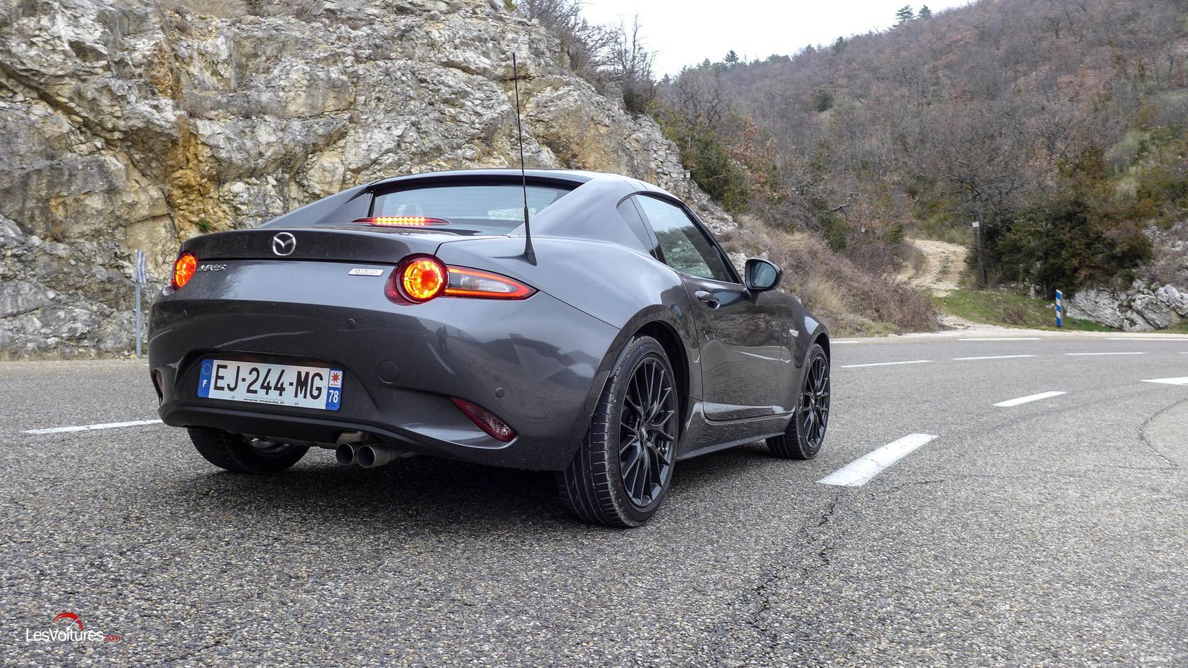 Un peu plus vite à l’attaque des virages et après avoir déconnecté les aides, la MX-5 RF est un régal de sportivité et d’aisance. Permissive à souhait, elle offre des sensations de conduite uniques et surtout abordables que l’on soit peu habitué, ou pas, à enchaîner les virages à vive allure mais toujours en respectant le code de la route. Le couple de 200 Nn (à 4 600 tr/min) est largement suffisant. C’est aussi fun qu’avec le roadster à toile et le différentiel à glissement limité, qui accompagne exclusivement le 2.0 l SKYACTIV-G est parfaitement paramétré. Le pack Sport, cité auparavant, contribue fortement au dynamisme de ce petit bijou japonais.