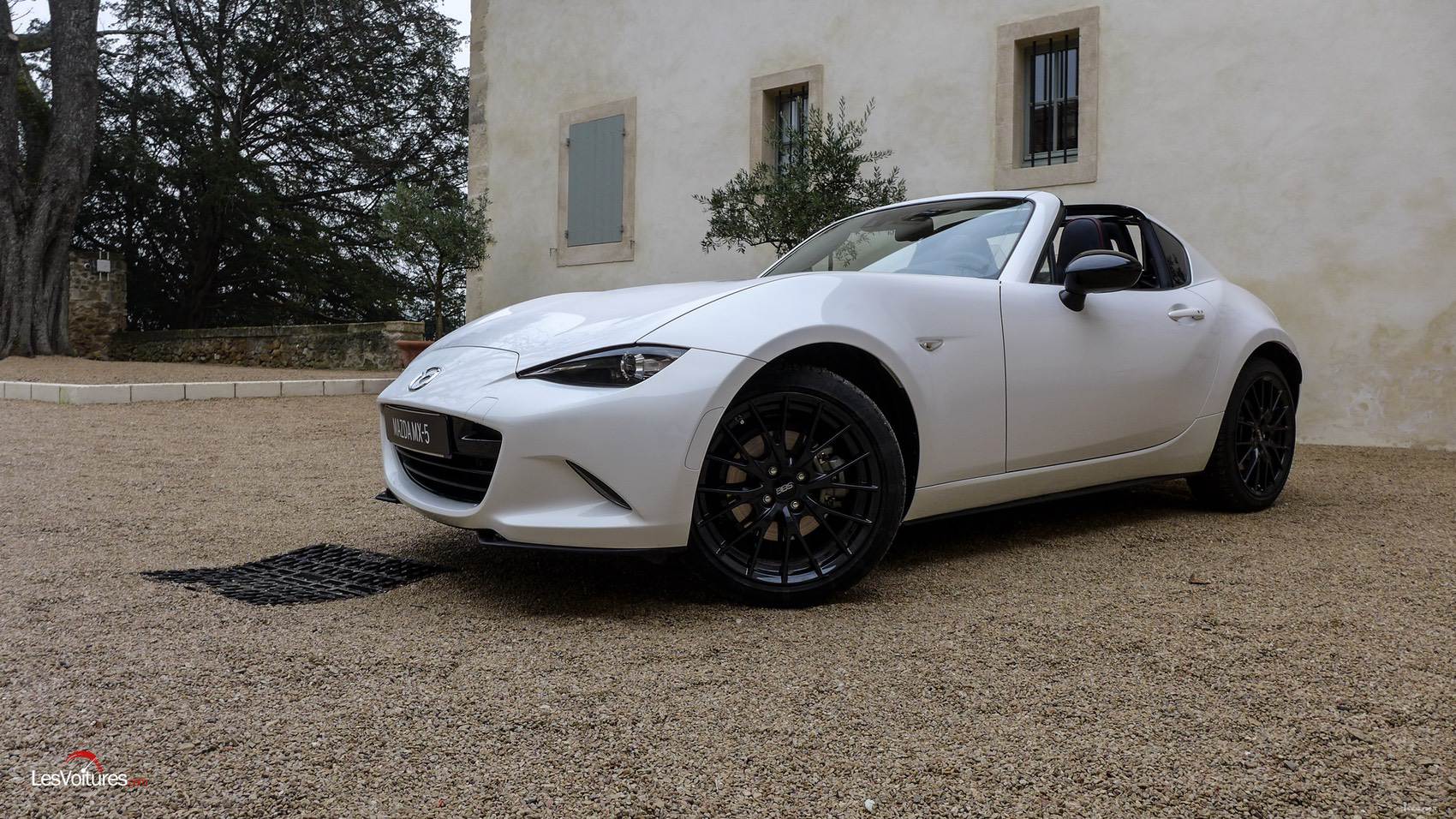 Pour encore plus de personnalité, c’est la nouvelle teinte sombre, Machine Grey, qui a été sélectionnée pour la First Edition de notre essai. Cette série de lancement du MX-5 RF est limitée à 130 exemplaires. Elle se distingue également de par son toi bi-ton Piano Black, des jantes BBS allliage 17″ Gunmetal, les sièges Recaro cuir/Alcantara, une finition également en Alcantara avec surpiqûres rouges et une plaque numérotée. Mais ce n’est pas tout car elle dispose des suspensions Sport Blistein, d’une barre anti-rapprochement et du différentiel à glissement limité. La majorité de ces éléments esthétiques et mécaniques peut être commandée en option sur un modèle standard grâce au pack Sport : 1 800 €. C’est le cas pour le roadster blanc de nos photos.