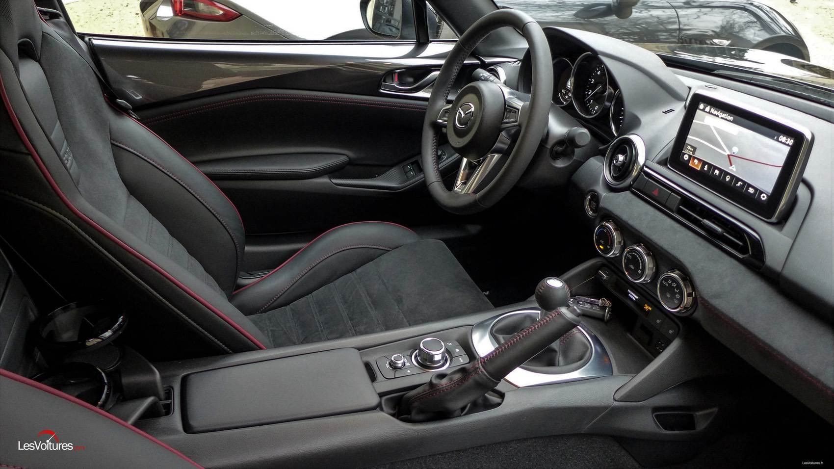 A l’intérieur, on retrouve à l’identique l’habitacle du MX-5 « funtastique », surnom que nous lui avons attribué lors de son essai (à lire ici). La position de conduite est très basse, au ras du sol, le volant est quasi- droit et le petit pare-brise,très proche, saute aux yeux. Malgré un espace réduit à son maximum qui conserve les mêmes dimensions que celles du modèle soft top, le réglage des sièges est donc aussi réduit. Il est parfois si bon de ne pas mesurer plus d’1 m 85 ! On se sent bien dans cette petite automobile dont toutes les commandes tombent parfaitement sous la main. Sans oublier un pédalier situé très proche du conducteur et une commande de boîte courte. Un fois assis, on plonge immédiatement dans une ambiance très sport mais aussi cossue. A noter que le volume du coffre ne perd que 3 l, soit une capacité de 127 l, l’équivalent de deux bagages cabine.